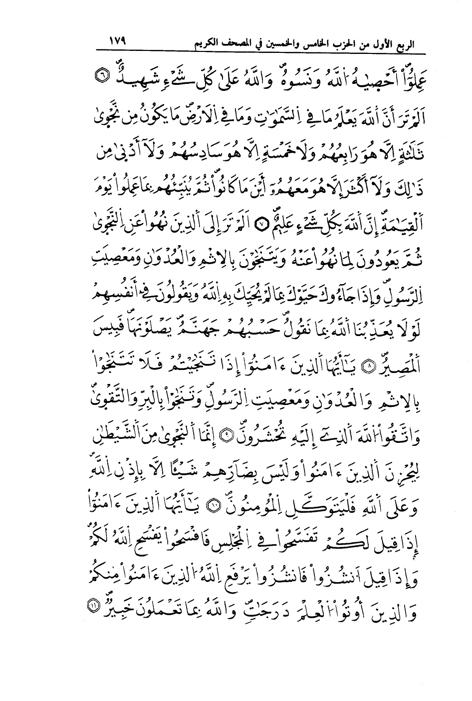 عَمِلُوا أَحْصَاهُ اللَّهُ وَنَسُوهُ وَاللَّهُ عَلَى كُلِّ شَيْءٍ شَهِيدٌ (6) أَلَمْ تَرَ أَنَّ اللَّهَ يَعْلَمُ مَا فِي السَّمَاوَاتِ وَمَا فِي الْأَرْضِ مَا يَكُونُ مِنْ نَجْوَى ثَلَاثَةٍ إِلَّا هُوَ رَابِعُهُمْ وَلَا خَمْسَةٍ إِلَّا هُوَ سَادِسُهُمْ وَلَا أَدْنَى مِنْ ذَلِكَ وَلَا أَكْثَرَ إِلَّا هُوَ مَعَهُمْ أَيْنَ مَا كَانُوا ثُمَّ يُنَبِّئُهُمْ بِمَا عَمِلُوا يَوْمَ الْقِيَامَةِ إِنَّ اللَّهَ بِكُلِّ شَيْءٍ عَلِيمٌ (7) أَلَمْ تَرَ إِلَى الَّذِينَ نُهُوا عَنِ النَّجْوَى ثُمَّ يَعُودُونَ لِمَا نُهُوا عَنْهُ وَيَتَنَاجَوْنَ بِالْإِثْمِ وَالْعُدْوَانِ وَمَعْصِيَتِ الرَّسُولِ وَإِذَا جَاءُوكَ حَيَّوْكَ بِمَا لَمْ يُحَيِّكَ بِهِ اللَّهُ وَيَقُولُونَ فِي أَنْفُسِهِمْ لَوْلَا يُعَذِّبُنَا اللَّهُ بِمَا نَقُولُ حَسْبُهُمْ جَهَنَّمُ يَصْلَوْنَهَا فَبِئْسَ الْمَصِيرُ (8) يَا أَيُّهَا الَّذِينَ آمَنُوا إِذَا تَنَاجَيْتُمْ فَلَا تَتَنَاجَوْا بِالْإِثْمِ وَالْعُدْوَانِ وَمَعْصِيَتِ الرَّسُولِ وَتَنَاجَوْا بِالْبِرِّ وَالتَّقْوَى وَاتَّقُوا اللَّهَ الَّذِي إِلَيْهِ تُحْشَرُونَ (9) إِنَّمَا النَّجْوَى مِنَ الشَّيْطَانِ لِيَحْزُنَ الَّذِينَ آمَنُوا وَلَيْسَ بِضَارِّهِمْ شَيْئًا إِلَّا بِإِذْنِ اللَّهِ وَعَلَى اللَّهِ فَلْيَتَوَكَّلِ الْمُؤْمِنُونَ (10) يَا أَيُّهَا الَّذِينَ آمَنُوا إِذَا قِيلَ لَكُمْ تَفَسَّحُوا فِي الْمَجَالِسِ فَافْسَحُوا يَفْسَحِ اللَّهُ لَكُمْ وَإِذَا قِيلَ انْشُزُوا فَانْشُزُوا يَرْفَعِ اللَّهُ الَّذِينَ آمَنُوا مِنْكُمْ وَالَّذِينَ أُوتُوا الْعِلْمَ دَرَجَاتٍ وَاللَّهُ بِمَا تَعْمَلُونَ خَبِيرٌ (11)