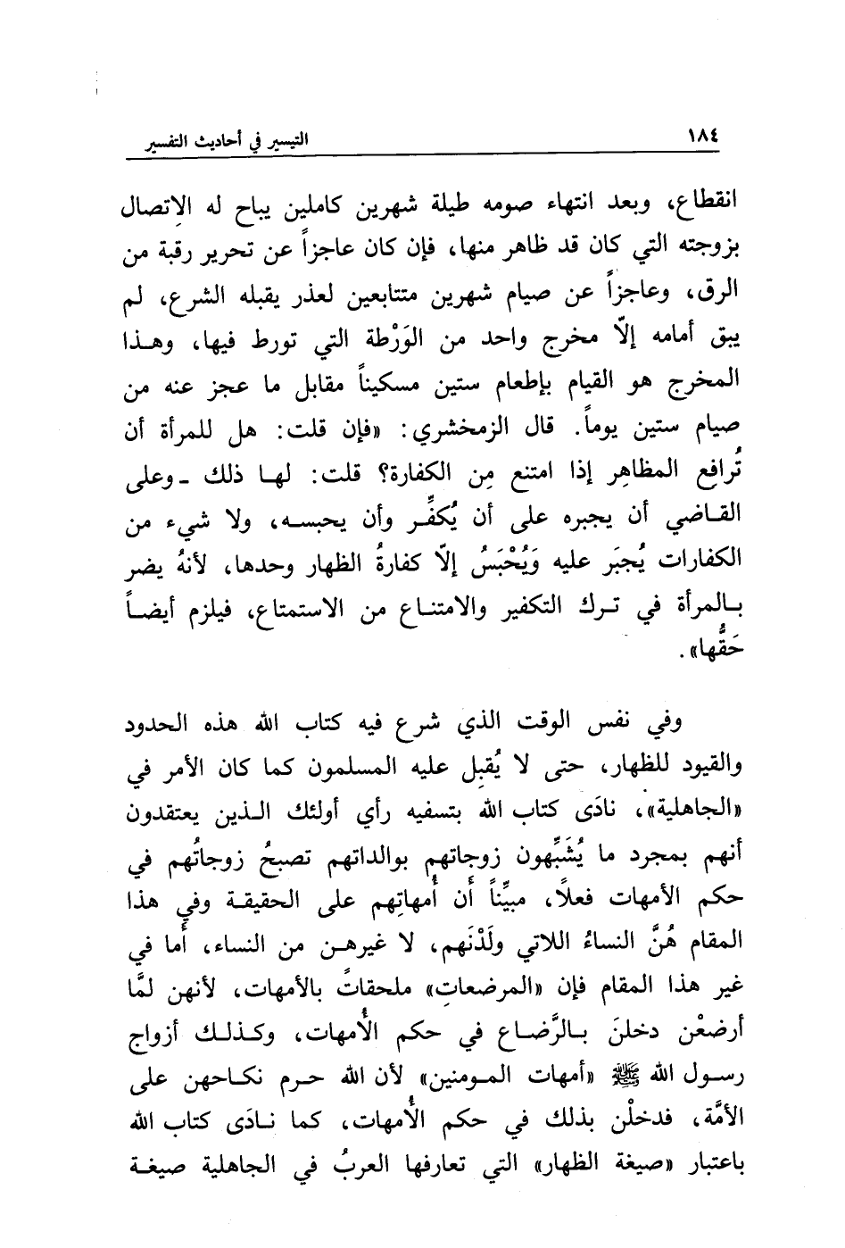 انقطاع، وبعد انتهاء صومه شهرين كاملين يباح له الاتصال بزوجته التي كان قد ظاهر منها، فإن كان عاجزا عن تحرير رقبة من الرق، وعاجزا عن صيام شهرين متتابعين لعذر يقبله الشرع، لم يبق أمامه إلا مخرج واحد من الورطة التي تورط فيها، وهذا المخرج هو القيام بإطعام ستين مسكينا مقابل ما عجز عنه من صيام ستين يوما. قال الزمخشري: " فإن قلت: هل للمرأة أن ترافع المظاهر إذا امتنع من الكفارة؟ قلت: لها ذلك - وعلى القاضي أن يجبره على أن يكفر وأن يحبسه، ولا شيء من الكفارات يجبر عليه ويحبس إلا كفارة الظهار وحدها، لأنه يضر بالمرأة في ترك التكفير والامتناع من الاستمتاع، فيلزم أيضا حقها ".