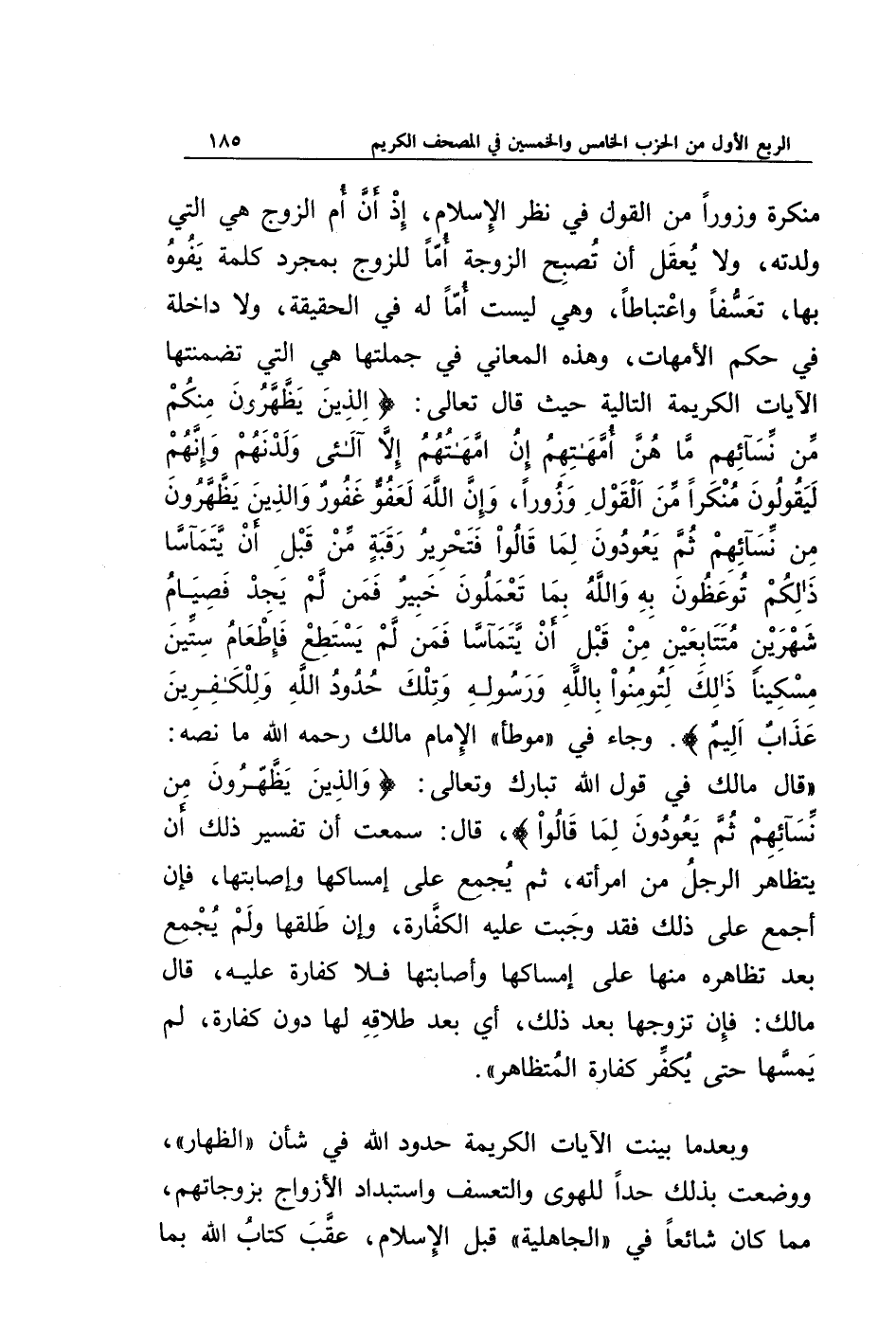 منكرة وزورا من القول في نظر الإسلام، إذ إن أم الزوج هي التي ولدته، ولا يعقل أن تصبح الزوجة أُمّا للزوج بمجرد كلمة يفوه بها، تعسفا واعتباطا، وهي ليست أما له في الحقيقة، ولا داخلة في حكم الأمهات، وهذه المعاني في جملتها هي التي تضمنتها الآيات الكريمة التالية حيث قال تعالى: {الَّذِينَ يُظَاهِرُونَ مِنْكُمْ مِنْ نِسَائِهِمْ مَا هُنَّ أُمَّهَاتِهِمْ إِنْ أُمَّهَاتُهُمْ إِلَّا اللَّائِي وَلَدْنَهُمْ وَإِنَّهُمْ لَيَقُولُونَ مُنْكَرًا مِنَ الْقَوْلِ وَزُورًا وَإِنَّ اللَّهَ لَعَفُوٌّ غَفُورٌ * وَالَّذِينَ يُظَاهِرُونَ مِنْ نِسَائِهِمْ ثُمَّ يَعُودُونَ لِمَا قَالُوا فَتَحْرِيرُ رَقَبَةٍ مِنْ قَبْلِ أَنْ يَتَمَاسَّا ذَلِكُمْ تُوعَظُونَ بِهِ وَاللَّهُ بِمَا تَعْمَلُونَ خَبِيرٌ * فَمَنْ لَمْ يَجِدْ فَصِيَامُ شَهْرَيْنِ مُتَتَابِعَيْنِ مِنْ قَبْلِ أَنْ يَتَمَاسَّا فَمَنْ لَمْ يَسْتَطِعْ فَإِطْعَامُ سِتِّينَ مِسْكِينًا ذَلِكَ لِتُؤْمِنُوا بِاللَّهِ وَرَسُولِهِ وَتِلْكَ حُدُودُ اللَّهِ وَلِلْكَافِرِينَ عَذَابٌ أَلِيمٌ}. وجاء في " موطأ " الإمام مالك رحمه الله ما نصه: " قال مالك في قول الله تبارك وتعالى: {وَالَّذِينَ يُظَاهِرُونَ مِنْ نِسَائِهِمْ ثُمَّ يَعُودُونَ لِمَا قَالُوا}، قال: سمعت أن تفسير ذلك أن يتظاهر الرجل من امرأته، ثم يجمع على إمساكها وإصابتها، فإن أجمع على ذلك فقد وجبت عليه الكفارة، وإن طلقها ولم يجمع بعد تظاهره منها على إمساكها وأصابتها فلا كفارة عليه، قال مالك: فإن تزوجها بعد ذلك، أي بعد طلاقه لها دون كفارة، لم يمسها حتى يكفر كفارة المتظاهر ".