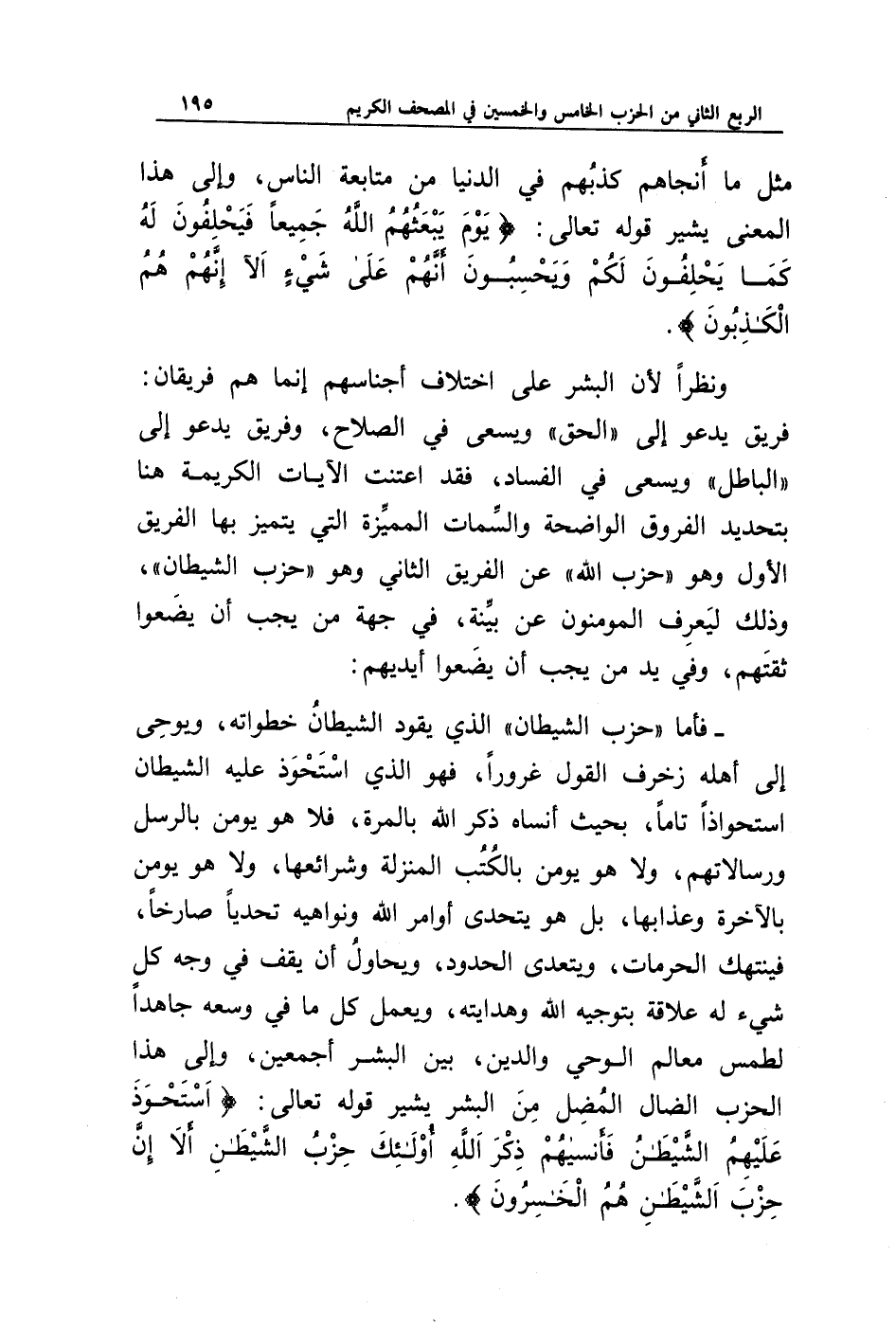 - فأما " حزب الشيطان " الذي يقود الشيطان خطواته، ويوحي إلى أهله زخرف القول غرورا، فهو الذي استحوذ عليه الشيطان استحواذا تاما، بحيث أنساه ذكر الله بالمرة، فلا هو من يؤمن بالرسل ورسالاتهم، ولا هو من يؤمن بالكتب المنزلة وشرائعها، ولا هو من يؤمن بالآخرة وعذابها، بل هو يتحدى أوامر الله ونواهيه تحديا صارخا، فينتهك الحرمات، ويتعدى الحدود، ويحاول أن يقف في وجه كل شيء له علاقة بتوحيد الله وهدايته، ويعمل كل ما في وسعه جاهدا لطمس معالم الوحي والدين، بين البشر أجمعين، وإلى هذا الحزب الضال المضل من البشر يشير قوله تعالى: {اسْتَحْوَذَ عَلَيْهِمُ الشَّيْطَانُ فَأَنْسَاهُمْ ذِكْرَ اللَّهِ أُولَئِكَ حِزْبُ الشَّيْطَانِ أَلَا إِنَّ حِزْبَ الشَّيْطَانِ هُمُ الْخَاسِرُونَ}.