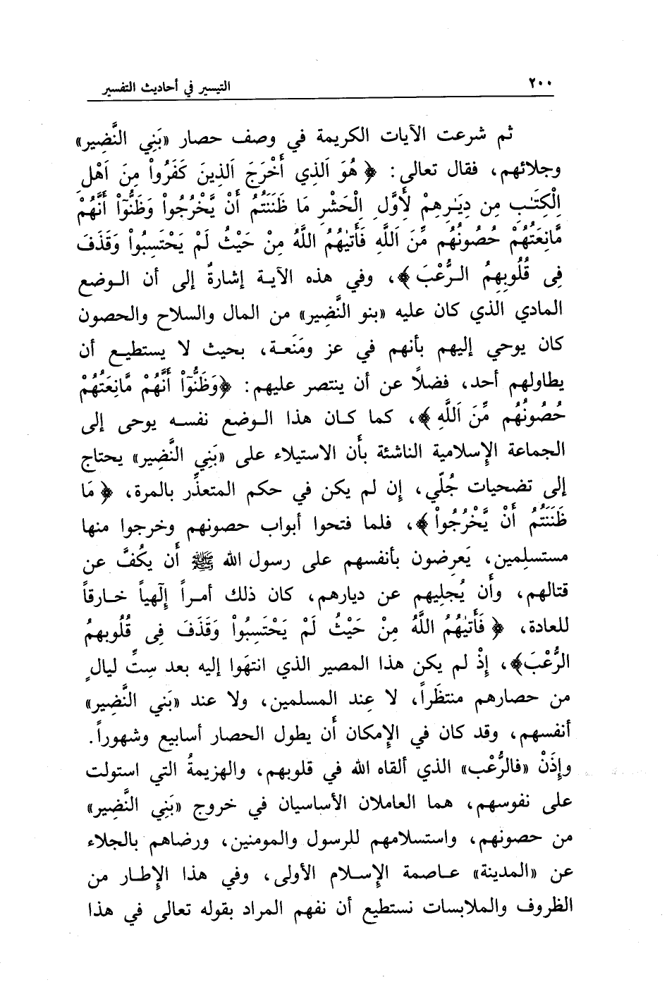 ثم شرعت الآيات الكريمة في وصف حصار " بني النضير " وجلائهم، فقال تعالى: {هُوَ الَّذِي أَخْرَجَ الَّذِينَ كَفَرُوا مِنْ أَهْلِ الْكِتَابِ مِنْ دِيَارِهِمْ لِأَوَّلِ الْحَشْرِ مَا ظَنَنْتُمْ أَنْ يَخْرُجُوا وَظَنُّوا أَنَّهُمْ مَانِعَتُهُمْ حُصُونُهُمْ مِنَ اللَّهِ فَأَتَاهُمُ اللَّهُ مِنْ حَيْثُ لَمْ يَحْتَسِبُوا وَقَذَفَ فِي قُلُوبِهِمُ الرُّعْبَ}، وفي هذه الآية إشارة إلى أن الوضع المادي الذي كان عليه " بنو النضير " من المال والسلاح والحصون كان يوحي إليهم بأنهم في عز ومنعة، بحيث لا يستطيع أن يطاولهم أحد، فضلا عن أن ينتصر عليهم: {وَظَنُّوا أَنَّهُمْ مَانِعَتُهُمْ حُصُونُهُمْ مِنَ اللَّهِ}، كما كان هذا الوضع نفسه يوحي إلى الجماعة الإسلامية الناشئة بأن الاستيلاء على " بني النضير " يحتاج إلى تضحيات جُلى، إن لم يكن في حكم المتعذر بالمرة، {مَا ظَنَنْتُمْ أَنْ يَخْرُجُوا}، فلما فتحوا أبواب حصونهم وخرجوا منها مستسلمين، يعرضون بأنفسهم على رسول الله صلى الله عليه وسلم أن يكف عن قتالهم، وأن يجليهم عن ديارهم، كان ذلك أمرا إلهيا خارقا للعادة، {فَأَتَاهُمُ اللَّهُ مِنْ حَيْثُ لَمْ يَحْتَسِبُوا وَقَذَفَ فِي قُلُوبِهِمُ الرُّعْبَ}، إذ لم يكن هذا المصير الذي انتهوا إليه بعد ست ليال من حصارهم منتظرا، لا عند المسلمين، ولا عند " بني النضير " أنفسهم، وقد كان في الإمكان أن يطول الحصار أسابيع وشهورا. وإذن " فالرعب " الذي ألقاه الله في قلوبهم، والهزيمة التي استولت على نفوسهم، هما العاملان الأساسيان في خروج " بني النضير " من حصونهم، واستسلامهم للرسول والمؤمنين، ورضاهم بالجلاء عن " المدينة " عاصمة الإسلام الأولى، وفي هذا الإطار من الظروف والملابسات نستطيع أن نفهم المراد بقوله تعالى في هذا
