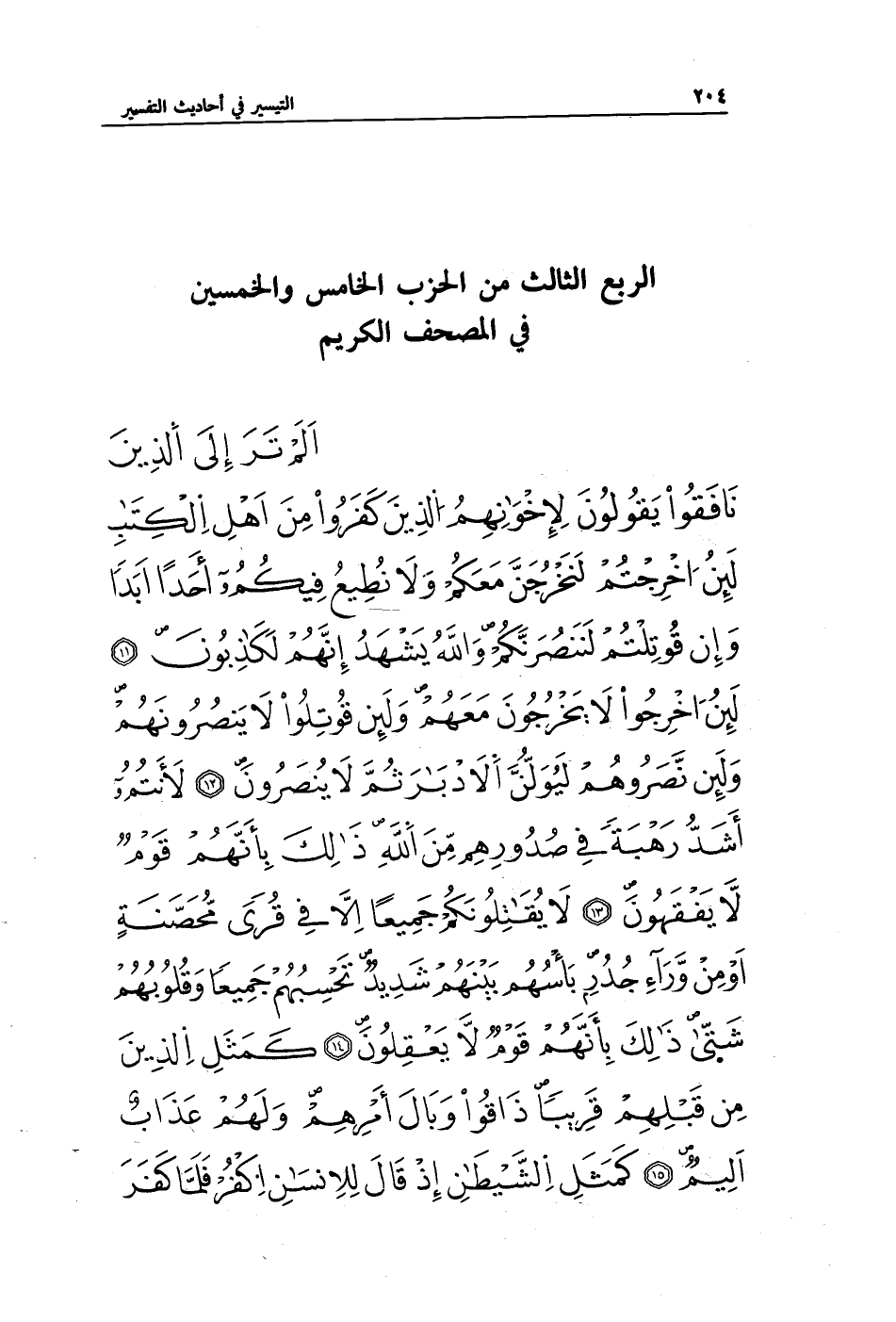 أَلَمْ تَرَ إِلَى الَّذِينَ نَافَقُوا يَقُولُونَ لِإِخْوَانِهِمُ الَّذِينَ كَفَرُوا مِنْ أَهْلِ الْكِتَابِ لَئِنْ أُخْرِجْتُمْ لَنَخْرُجَنَّ مَعَكُمْ وَلَا نُطِيعُ فِيكُمْ أَحَدًا أَبَدًا وَإِنْ قُوتِلْتُمْ لَنَنْصُرَنَّكُمْ وَاللَّهُ يَشْهَدُ إِنَّهُمْ لَكَاذِبُونَ (11) لَئِنْ أُخْرِجُوا لَا يَخْرُجُونَ مَعَهُمْ وَلَئِنْ قُوتِلُوا لَا يَنْصُرُونَهُمْ وَلَئِنْ نَصَرُوهُمْ لَيُوَلُّنَّ الْأَدْبَارَ ثُمَّ لَا يُنْصَرُونَ (12) لَأَنْتُمْ أَشَدُّ رَهْبَةً فِي صُدُورِهِمْ مِنَ اللَّهِ ذَلِكَ بِأَنَّهُمْ قَوْمٌ لَا يَفْقَهُونَ (13) لَا يُقَاتِلُونَكُمْ جَمِيعًا إِلَّا فِي قُرًى مُحَصَّنَةٍ أَوْ مِنْ وَرَاءِ جُدُرٍ بَأْسُهُمْ بَيْنَهُمْ شَدِيدٌ تَحْسَبُهُمْ جَمِيعًا وَقُلُوبُهُمْ شَتَّى ذَلِكَ بِأَنَّهُمْ قَوْمٌ لَا يَعْقِلُونَ (14) كَمَثَلِ الَّذِينَ مِنْ قَبْلِهِمْ قَرِيبًا ذَاقُوا وَبَالَ أَمْرِهِمْ وَلَهُمْ عَذَابٌ أَلِيمٌ (15) كَمَثَلِ الشَّيْطَانِ إِذْ قَالَ لِلْإِنْسَانِ اكْفُرْ فَلَمَّا كَفَرَ