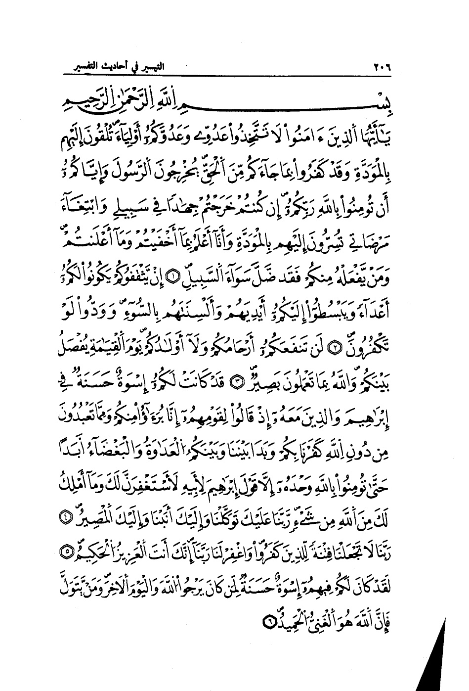 يَا أَيُّهَا الَّذِينَ آمَنُوا لَا تَتَّخِذُوا عَدُوِّي وَعَدُوَّكُمْ أَوْلِيَاءَ تُلْقُونَ إِلَيْهِمْ بِالْمَوَدَّةِ وَقَدْ كَفَرُوا بِمَا جَاءَكُمْ مِنَ الْحَقِّ يُخْرِجُونَ الرَّسُولَ وَإِيَّاكُمْ أَنْ تُؤْمِنُوا بِاللَّهِ رَبِّكُمْ إِنْ كُنْتُمْ خَرَجْتُمْ جِهَادًا فِي سَبِيلِي وَابْتِغَاءَ مَرْضَاتِي تُسِرُّونَ إِلَيْهِمْ بِالْمَوَدَّةِ وَأَنَا أَعْلَمُ بِمَا أَخْفَيْتُمْ وَمَا أَعْلَنْتُمْ وَمَنْ يَفْعَلْهُ مِنْكُمْ فَقَدْ ضَلَّ سَوَاءَ السَّبِيلِ (1) إِنْ يَثْقَفُوكُمْ يَكُونُوا لَكُمْ أَعْدَاءً وَيَبْسُطُوا إِلَيْكُمْ أَيْدِيَهُمْ وَأَلْسِنَتَهُمْ بِالسُّوءِ وَوَدُّوا لَوْ تَكْفُرُونَ (2) لَنْ تَنْفَعَكُمْ أَرْحَامُكُمْ وَلَا أَوْلَادُكُمْ يَوْمَ الْقِيَامَةِ يَفْصِلُ بَيْنَكُمْ وَاللَّهُ بِمَا تَعْمَلُونَ بَصِيرٌ (3) قَدْ كَانَتْ لَكُمْ أُسْوَةٌ حَسَنَةٌ فِي إِبْرَاهِيمَ وَالَّذِينَ مَعَهُ إِذْ قَالُوا لِقَوْمِهِمْ إِنَّا بُرَآءُ مِنْكُمْ وَمِمَّا تَعْبُدُونَ مِنْ دُونِ اللَّهِ كَفَرْنَا بِكُمْ وَبَدَا بَيْنَنَا وَبَيْنَكُمُ الْعَدَاوَةُ وَالْبَغْضَاءُ أَبَدًا حَتَّى تُؤْمِنُوا بِاللَّهِ وَحْدَهُ إِلَّا قَوْلَ إِبْرَاهِيمَ لِأَبِيهِ لَأَسْتَغْفِرَنَّ لَكَ وَمَا أَمْلِكُ لَكَ مِنَ اللَّهِ مِنْ شَيْءٍ رَبَّنَا عَلَيْكَ تَوَكَّلْنَا وَإِلَيْكَ أَنَبْنَا وَإِلَيْكَ الْمَصِيرُ (4) رَبَّنَا لَا تَجْعَلْنَا فِتْنَةً لِلَّذِينَ كَفَرُوا وَاغْفِرْ لَنَا رَبَّنَا إِنَّكَ أَنْتَ الْعَزِيزُ الْحَكِيمُ (5) لَقَدْ كَانَ لَكُمْ فِيهِمْ أُسْوَةٌ حَسَنَةٌ لِمَنْ كَانَ يَرْجُو اللَّهَ وَالْيَوْمَ الْآخِرَ وَمَنْ يَتَوَلَّ فَإِنَّ اللَّهَ هُوَ الْغَنِيُّ الْحَمِيدُ (6)
