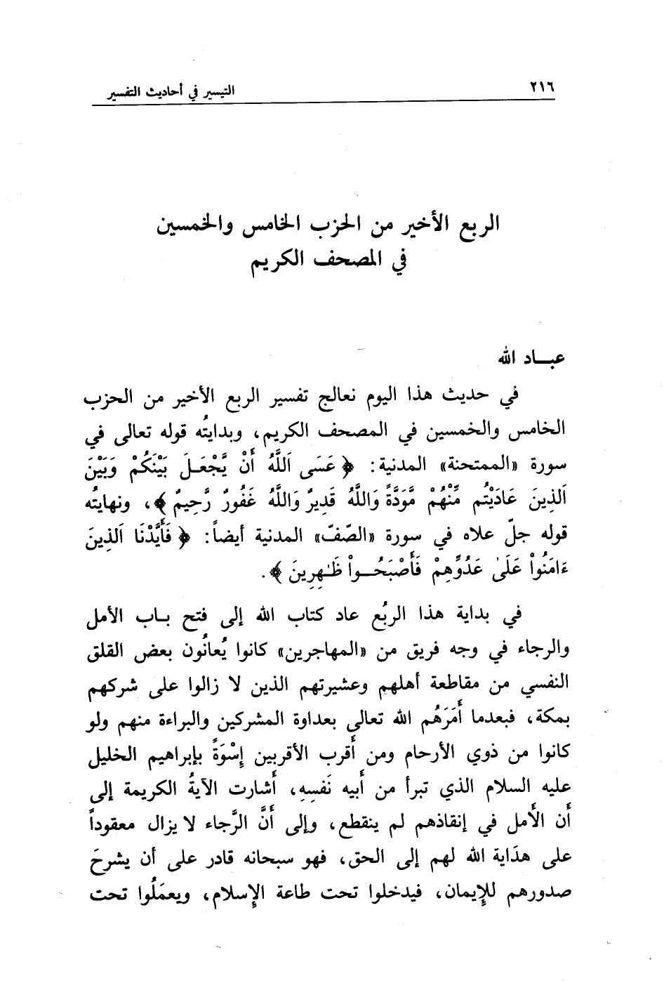 في حديث هذا اليوم نعالج تفسير الربع الأخير من الحزب الخامس والخمسين في المصحف الكريم، وبدايته قوله تعالى في سورة "الممتحنة" المدنية: {عَسَى اللَّهُ أَنْ يَجْعَلَ بَيْنَكُمْ وَبَيْنَ الَّذِينَ عَادَيْتُمْ مِنْهُمْ مَوَدَّةً وَاللَّهُ قَدِيرٌ وَاللَّهُ غَفُورٌ رَحِيمٌ}، ونهايته قوله جل علاه في سورة "الصف" المدنية أيضا: {فَأَيَّدْنَا الَّذِينَ آمَنُوا عَلَى عَدُوِّهِمْ فَأَصْبَحُوا ظَاهِرِينَ}.