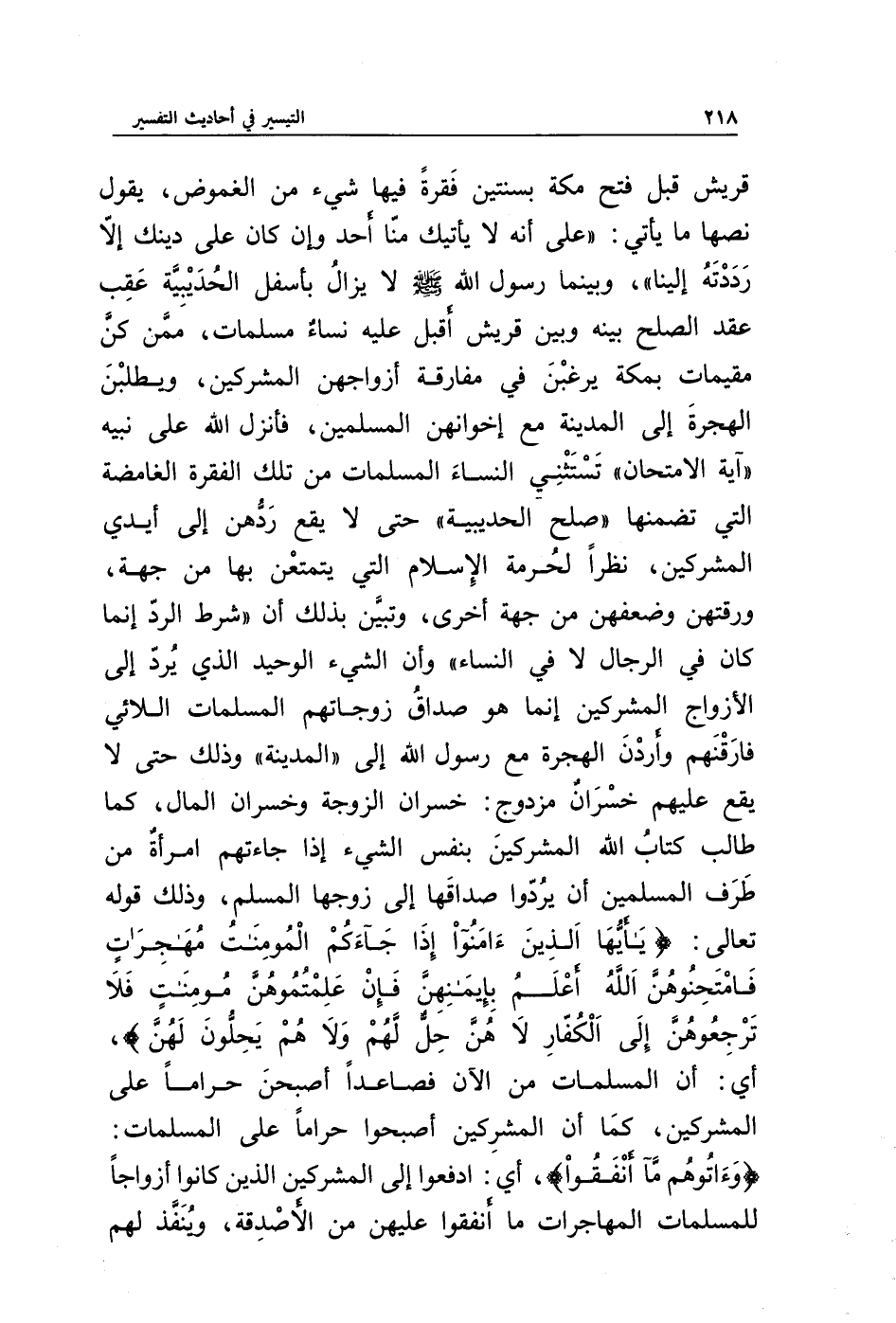 قريش قبل فتح مكة بسنتين فقرة فيها شيء من الغموض، يقول نصها ما يأتي: " على أنه لا يأتيك منا أحد وإن كان على دينك إلا رددته إلينا "، وبينما رسول الله صلى الله عليه وسلم لا يزال بأسفل الحديبية عقب عقد الصلح بينه وبين قريش أقبل عليه نساء مسلمات، ممن كن مقيمات بمكة يرغبن في مفارقة أزواجهن المشركين، ويطلبن الهجرة إلى المدينة مع إخوانهن المسلمين، فأنزل الله على نبيه " آية الامتحان " تستثني النساء المسلمات من تلك الفقرة الغامضة التي تضمنها " صلح الحديبية " حتى لا يقع ردهن إلى أيدي المشركين، نظرا لحرمة الإسلام التي يتمتعن بها من جهة، ورقتهن وضعفهن من جهة أخرى، وتبين بذلك أن " شرط الرد إنما كان في الرجال لا في النساء " وأن الشيء الوحيد الذي يرد إلى الأزواج المشركين إنما هو صداق زوجاتهم المسلمات اللائي فارقنهم وأردن الهجرة مع رسول الله إلى " المدينة " وذلك حتى لا يقع عليهم خسران مزدوج: خسران الزوجة وخسران المال، كما طالب كتاب الله المشركين بنفس الشيء إذا جاءتهم امرأة من طرف المسلمين أن يردوا صداقها إلى زوجها المسلم، وذلك قوله تعالى: {يَا أَيُّهَا الَّذِينَ آمَنُوا إِذَا جَاءَكُمُ الْمُؤْمِنَاتُ مُهَاجِرَاتٍ فَامْتَحِنُوهُنَّ اللَّهُ أَعْلَمُ بِإِيمَانِهِنَّ فَإِنْ عَلِمْتُمُوهُنَّ مُؤْمِنَاتٍ فَلَا تَرْجِعُوهُنَّ إِلَى الْكُفَّارِ لَا هُنَّ حِلٌّ لَهُمْ وَلَا هُمْ يَحِلُّونَ لَهُنَّ}، أي: أن المسلمات من الآن فصاعدا أصبحن حراما على المشركين، كما أن المشركين أصبحوا حراما على المسلمات: {وَآتُوهُمْ مَا أَنْفَقُوا}، أي: ادفعوا إلى المشركين الذين كانوا أزواجا للمسلمات المهاجرات ما أنفقوا عليهن من الأصدقة، وينفذ لهم