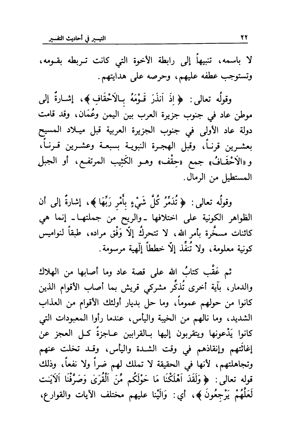 وقوله تعالى: {إِذْ أَنْذَرَ قَوْمَهُ بِالْأَحْقَافِ}، إشارة إلى موطن عاد في جنوب جزيرة العرب بين اليمن وعمان، وقد قامت دولة عاد الأولى في جنوب الجزيرة العربية قبل ميلاد المسيح بعشرين قرنا، وقبل الهجرة النبوية بسبعة وعشرين قرنا، و " الأحقاف " جمع " حقف " وهو الكثيب المرتفع، أو الجبل المستطيل من الرمال.