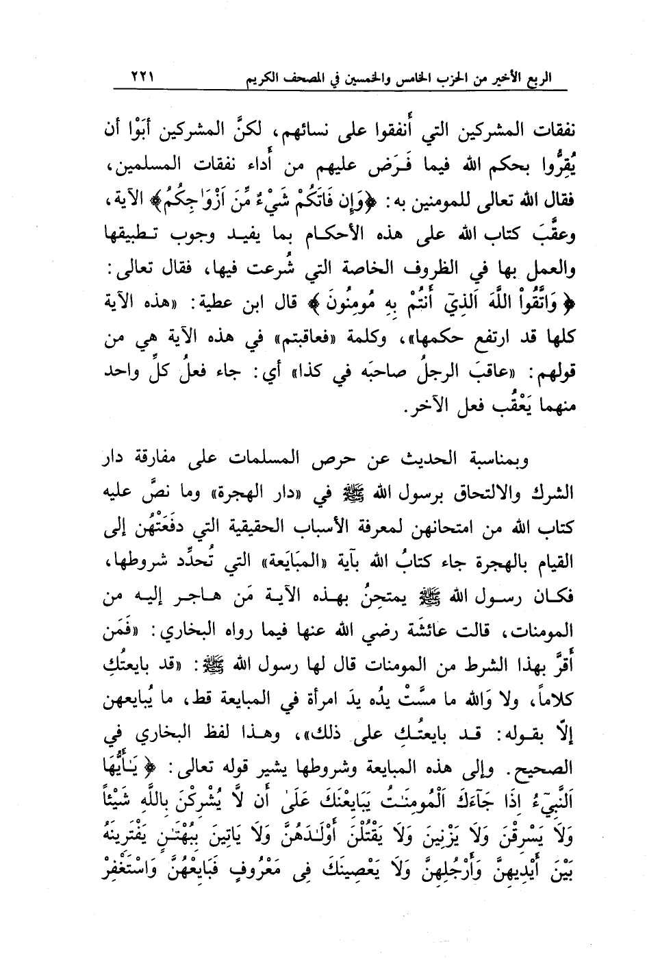 وبمناسبة الحديث عن حرص المسلمات على مفارقة دار الشرك والالتحاق برسول الله صلى الله عليه وسلم في " دار الهجرة " وما نص عليه كتاب الله من امتحانهن لمعرفة الأسباب الحقيقية التي دفعتهن إلى القيام بالهجرة جاء كتاب الله بآية " المبايعة " التي تحدد شروطها، فكان رسول الله صلى الله عليه وسلم يمتحن بهذه الآية من هاجر إليه من المؤمنات، قالت عائشة رضي الله عنها فيما رواه البخاري: " فمن أقر بهذا الشرط من المؤمنات قال لها رسول الله صلى الله عليه وسلم: " قد بايعتك كلاما، ولا والله ما مست يده يد امرأة في المبايعة قط، ما يبايعهن إلا بقوله: قد بايعتك على ذلك "، وهذا لفظ البخاري في الصحيح. وإلى هذه المبايعة وشروطها يشير قوله تعالى: {يَا أَيُّهَا النَّبِيُّ إِذَا جَاءَكَ الْمُؤْمِنَاتُ يُبَايِعْنَكَ عَلَى أَنْ لَا يُشْرِكْنَ بِاللَّهِ شَيْئًا وَلَا يَسْرِقْنَ وَلَا يَزْنِينَ وَلَا يَقْتُلْنَ أَوْلَادَهُنَّ وَلَا يَأْتِينَ بِبُهْتَانٍ يَفْتَرِينَهُ بَيْنَ أَيْدِيهِنَّ وَأَرْجُلِهِنَّ وَلَا يَعْصِينَكَ فِي مَعْرُوفٍ فَبَايِعْهُنَّ وَاسْتَغْفِرْ
