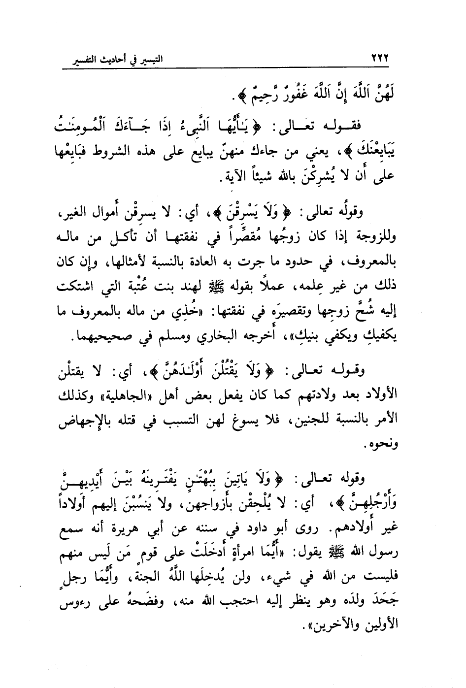 وقوله تعالى: {وَلَا يَقْتُلْنَ أَوْلَادَهُنَّ}، أي: لا يقتلن الأولاد بعد ولادتهم كما كان يفعل بعض أهل " الجاهلية " وكذلك الأمر بالنسبة للجنين، فلا يسوغ لهن التسبب في قتله بالإجهاض ونحوه.