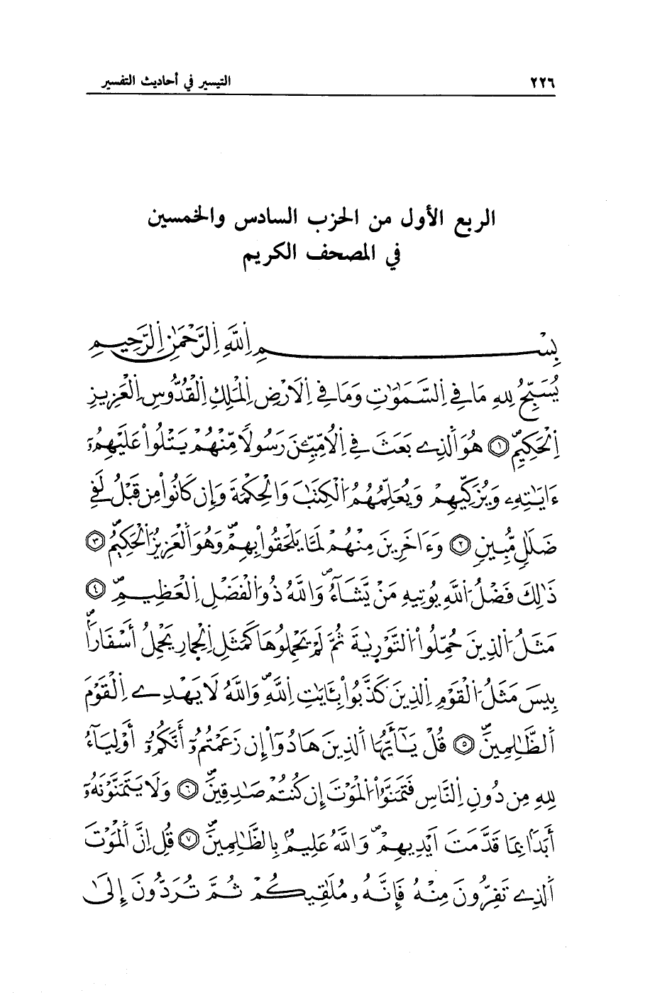 يُسَبِّحُ لِلَّهِ مَا فِي السَّمَاوَاتِ وَمَا فِي الْأَرْضِ الْمَلِكِ الْقُدُّوسِ الْعَزِيزِ الْحَكِيمِ (1) هُوَ الَّذِي بَعَثَ فِي الْأُمِّيِّينَ رَسُولًا مِنْهُمْ يَتْلُو عَلَيْهِمْ آيَاتِهِ وَيُزَكِّيهِمْ وَيُعَلِّمُهُمُ الْكِتَابَ وَالْحِكْمَةَ وَإِنْ كَانُوا مِنْ قَبْلُ لَفِي ضَلَالٍ مُبِينٍ (2) وَآخَرِينَ مِنْهُمْ لَمَّا يَلْحَقُوا بِهِمْ وَهُوَ الْعَزِيزُ الْحَكِيمُ (3) ذَلِكَ فَضْلُ اللَّهِ يُؤْتِيهِ مَنْ يَشَاءُ وَاللَّهُ ذُو الْفَضْلِ الْعَظِيمِ (4) مَثَلُ الَّذِينَ حُمِّلُوا التَّوْرَاةَ ثُمَّ لَمْ يَحْمِلُوهَا كَمَثَلِ الْحِمَارِ يَحْمِلُ أَسْفَارًا بِئْسَ مَثَلُ الْقَوْمِ الَّذِينَ كَذَّبُوا بِآيَاتِ اللَّهِ وَاللَّهُ لَا يَهْدِي الْقَوْمَ الظَّالِمِينَ (5) قُلْ يَا أَيُّهَا الَّذِينَ هَادُوا إِنْ زَعَمْتُمْ أَنَّكُمْ أَوْلِيَاءُ لِلَّهِ مِنْ دُونِ النَّاسِ فَتَمَنَّوُا الْمَوْتَ إِنْ كُنْتُمْ صَادِقِينَ (6) وَلَا يَتَمَنَّوْنَهُ أَبَدًا بِمَا قَدَّمَتْ أَيْدِيهِمْ وَاللَّهُ عَلِيمٌ بِالظَّالِمِينَ (7) قُلْ إِنَّ الْمَوْتَ الَّذِي تَفِرُّونَ مِنْهُ فَإِنَّهُ مُلَاقِيكُمْ ثُمَّ تُرَدُّونَ إِلَى