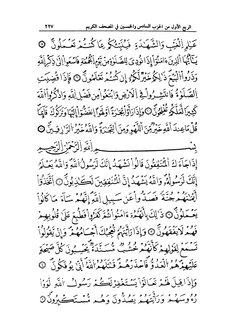 إِذَا جَاءَكَ الْمُنَافِقُونَ قَالُوا نَشْهَدُ إِنَّكَ لَرَسُولُ اللَّهِ وَاللَّهُ يَعْلَمُ إِنَّكَ لَرَسُولُهُ وَاللَّهُ يَشْهَدُ إِنَّ الْمُنَافِقِينَ لَكَاذِبُونَ (1) اتَّخَذُوا أَيْمَانَهُمْ جُنَّةً فَصَدُّوا عَنْ سَبِيلِ اللَّهِ إِنَّهُمْ سَاءَ مَا كَانُوا يَعْمَلُونَ (2) ذَلِكَ بِأَنَّهُمْ آمَنُوا ثُمَّ كَفَرُوا فَطُبِعَ عَلَى قُلُوبِهِمْ فَهُمْ لَا يَفْقَهُونَ (3) وَإِذَا رَأَيْتَهُمْ تُعْجِبُكَ أَجْسَامُهُمْ وَإِنْ يَقُولُوا تَسْمَعْ لِقَوْلِهِمْ كَأَنَّهُمْ خُشُبٌ مُسَنَّدَةٌ يَحْسَبُونَ كُلَّ صَيْحَةٍ عَلَيْهِمْ هُمُ الْعَدُوُّ فَاحْذَرْهُمْ قَاتَلَهُمُ اللَّهُ أَنَّى يُؤْفَكُونَ (4) وَإِذَا قِيلَ لَهُمْ تَعَالَوْا يَسْتَغْفِرْ لَكُمْ رَسُولُ اللَّهِ لَوَّوْا رُءُوسَهُمْ وَرَأَيْتَهُمْ يَصُدُّونَ وَهُمْ مُسْتَكْبِرُونَ (5)