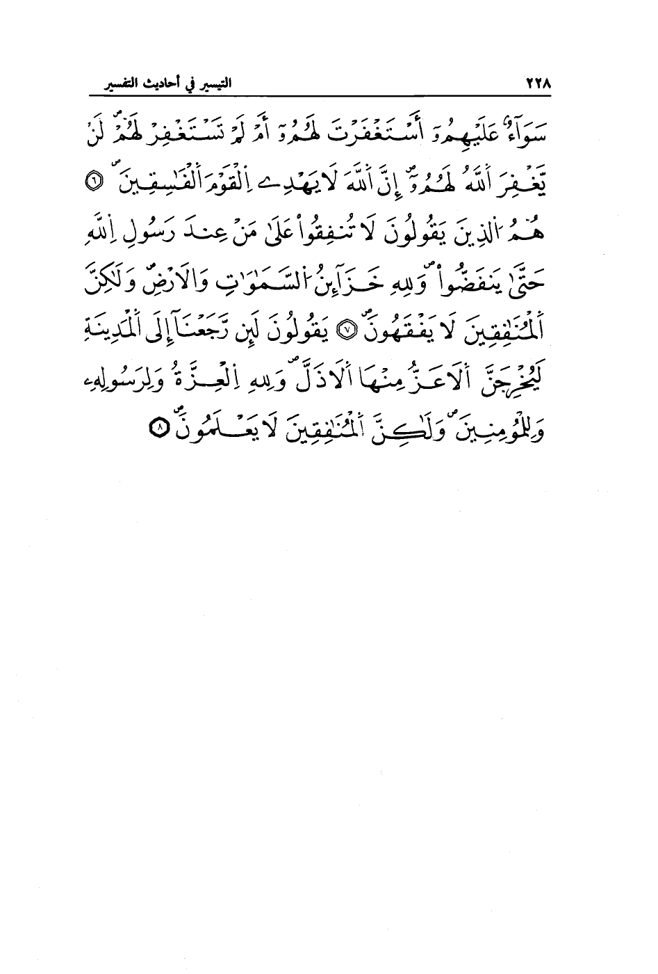 سَوَاءٌ عَلَيْهِمْ أَسْتَغْفَرْتَ لَهُمْ أَمْ لَمْ تَسْتَغْفِرْ لَهُمْ لَنْ يَغْفِرَ اللَّهُ لَهُمْ إِنَّ اللَّهَ لَا يَهْدِي الْقَوْمَ الْفَاسِقِينَ (6) هُمُ الَّذِينَ يَقُولُونَ لَا تُنْفِقُوا عَلَى مَنْ عِنْدَ رَسُولِ اللَّهِ حَتَّى يَنْفَضُّوا وَلِلَّهِ خَزَائِنُ السَّمَاوَاتِ وَالْأَرْضِ وَلَكِنَّ الْمُنَافِقِينَ لَا يَفْقَهُونَ (7) يَقُولُونَ لَئِنْ رَجَعْنَا إِلَى الْمَدِينَةِ لَيُخْرِجَنَّ الْأَعَزُّ مِنْهَا الْأَذَلَّ وَلِلَّهِ الْعِزَّةُ وَلِرَسُولِهِ وَلِلْمُؤْمِنِينَ وَلَكِنَّ الْمُنَافِقِينَ لَا يَعْلَمُونَ (8)