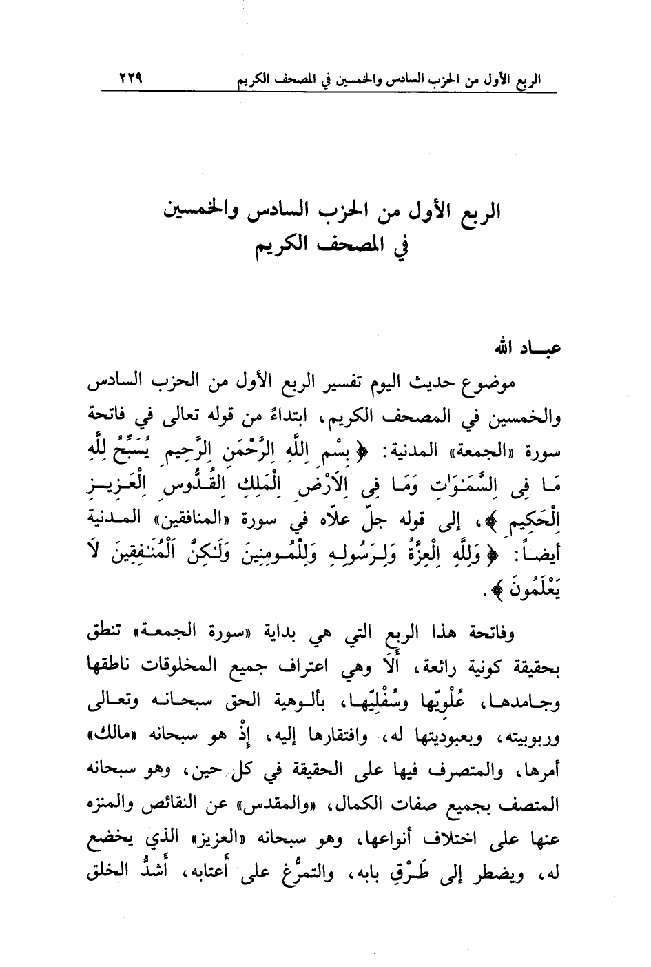 موضوع حديث اليوم تفسير الربع الأول من الحزب السادس والخمسين في المصحف الكريم، ابتداء من قوله تعالى في فاتحة سورة "الجمعة" المدنية: {بسم الله الرحمن الرحيم يُسَبِّحُ لِلَّهِ مَا فِي السَّمَاوَاتِ وَمَا فِي الْأَرْضِ الْمَلِكِ الْقُدُّوسِ الْعَزِيزِ الْحَكِيمِ}، إلى قوله جل علاه في سورة "المنافقين" المدنية أيضا: {وَلِلَّهِ الْعِزَّةُ وَلِرَسُولِهِ وَلِلْمُؤْمِنِينَ وَلَكِنَّ الْمُنَافِقِينَ لَا يَعْلَمُونَ}.