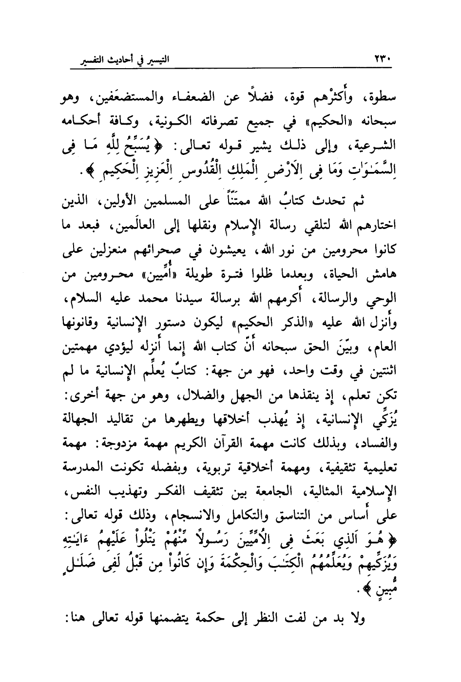 ثم تحدث كتاب الله ممتنا على المسلمين الأولين، الذين اختارهم الله لتلقي رسالة الإسلام ونقلها إلى العالمين، فبعد ما كانوا محرومين من نور الله، يعيشون في صحرائهم منعزلين على هامش الحياة، وبعدما ظلوا فترة طويلة " أمّيّين " محرومين من الوحي والرسالة، أكرمهم الله برسالة سيدنا محمد عليه السلام، وأنزل الله عليه " الذكر الحكيم " ليكون دستور الإنسانية وقانونها العام، وبين الحق سبحانه أن كتاب الله إنما أنزله ليؤدي مهمتين اثنين في وقت واحد، فهو من جهة: كتاب يعلم الإنسانية ما لم تكن تعلم، إذ ينقذها من الجهل والضلال، ومن جهة أخرى: يزكّي الإنسانية، إذ يهذب أخلاقها ويطهرها من تقاليد الجهالة والفساد، وبذلك كانت مهمة القرآن الكريم مهمة مزدوجة: مهمة تعليمية تثقيفية، ومهمة أخلاقية تربوية، وبفضله تكونت المدرسة الإسلامية المثالية، الجامعة بين تثقيف الفكر وتهذيب النفس، على أساس من التناسق والتكامل والانسجام، وذلك قوله تعالى: {هُوَ الَّذِي بَعَثَ فِي الْأُمِّيِّينَ رَسُولًا مِنْهُمْ يَتْلُو عَلَيْهِمْ آيَاتِهِ وَيُزَكِّيهِمْ وَيُعَلِّمُهُمُ الْكِتَابَ وَالْحِكْمَةَ وَإِنْ كَانُوا مِنْ قَبْلُ لَفِي ضَلَالٍ مُبِينٍ}.