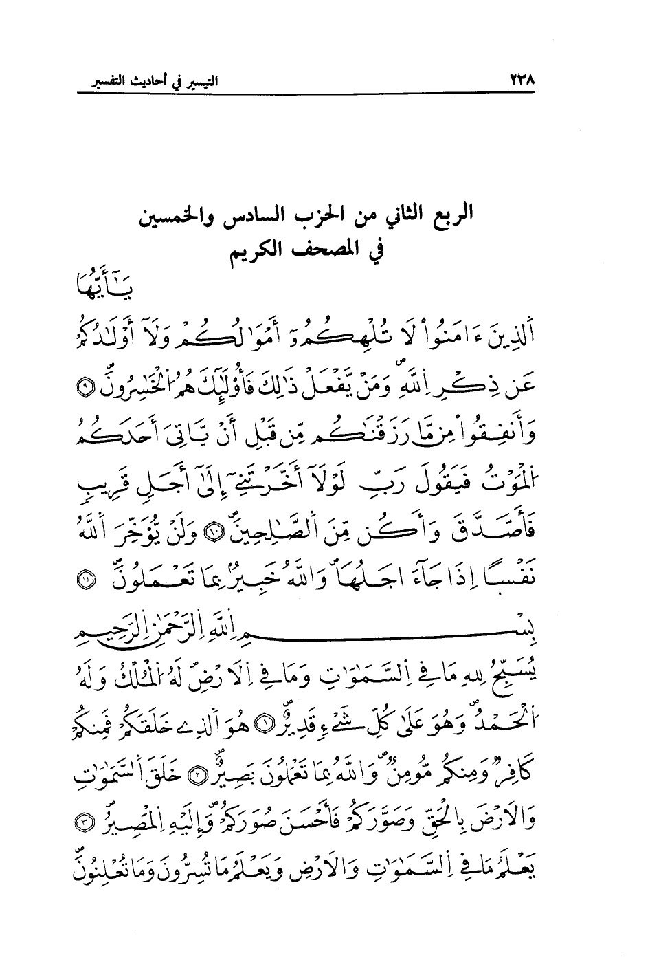 يُسَبِّحُ لِلَّهِ مَا فِي السَّمَاوَاتِ وَمَا فِي الْأَرْضِ لَهُ الْمُلْكُ وَلَهُ الْحَمْدُ وَهُوَ عَلَى كُلِّ شَيْءٍ قَدِيرٌ (1) هُوَ الَّذِي خَلَقَكُمْ فَمِنْكُمْ كَافِرٌ وَمِنْكُمْ مُؤْمِنٌ وَاللَّهُ بِمَا تَعْمَلُونَ بَصِيرٌ (2) خَلَقَ السَّمَاوَاتِ وَالْأَرْضَ بِالْحَقِّ وَصَوَّرَكُمْ فَأَحْسَنَ صُوَرَكُمْ وَإِلَيْهِ الْمَصِيرُ (3) يَعْلَمُ مَا فِي السَّمَاوَاتِ وَالْأَرْضِ وَيَعْلَمُ مَا تُسِرُّونَ وَمَا تُعْلِنُونَ