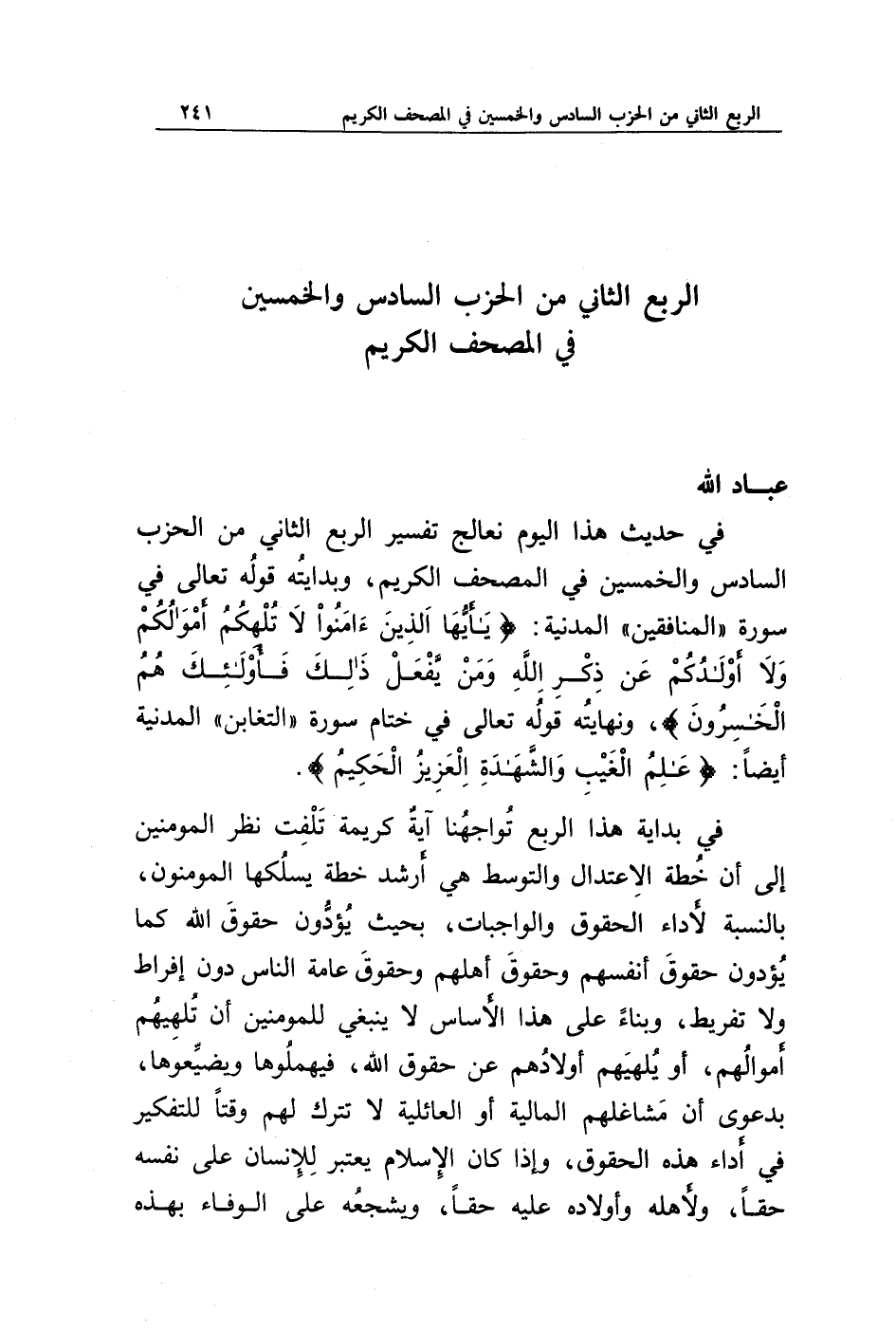 في بداية هذا الربع تواجهنا آية كريمة تلفت نظر المؤمنين إلى أن خُطة الاعتدال والتوسط هي أرشد خطة يسلكها المؤمنون، بالنسبة لأداء الحقوق والواجبات، بحيث يؤدون حقوق الله كما يؤدون حقوق أنفسهم وحقوق أهلهم وحقوق عامة الناس دون إفراط ولا تفريط، وبناء على هذا الأساس لا ينبغي للمؤمنين أن تلهيهم أموالهم، أو يلهيهم أولادهم عن حقوق الله، فيهملوها ويضيعوها، بدعوى أن مشاغلهم المالية أو العائلية لا تترك لهم وقتا للتفكير في أداء هذه الحقوق، وإذا كان الإسلام يعتبر للإنسان على نفسه حقا، ولأهله وأولاده عليه حقا، ويشجعه على الوفاء بهذه