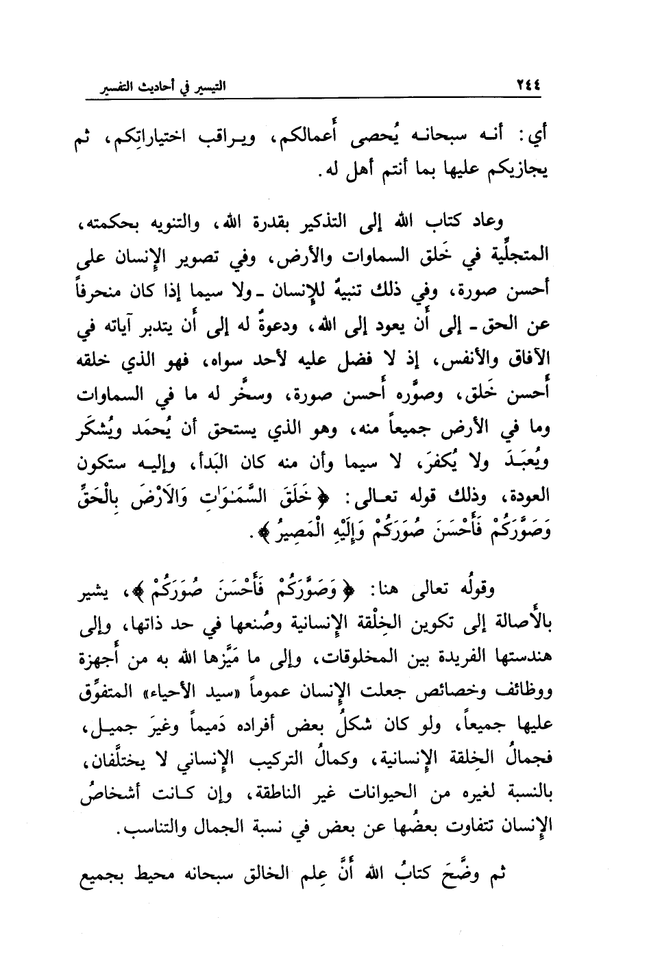 وعاد كتاب الله إلى التذكير بقدرة الله، والتنويه بحكمته، المتجلية في خلق السماوات والأرض، وفي تصوير الإنسان على أحسن صورة، وفي ذلك تنبيه للإنسان - ولا سيما إذا كان منحرفا عن الحق- إلى أن يعود إلى الله، ودعوة له إلى أن يتدبر آياته في الآفاق والأنفس، إذ لا فضل عليه لأحد سواه، فهو الذي خلقه أحسن خلق، وصوّره أحسن صورة، وسخر له ما في السماوات وما في الأرض جميعا منه، وهو الذي يستحق أن يُحمد ويُشكر ويُعبد ولا يُكفر، لا سيما وأن منه كان البدء، وإليه ستكون العودة، وذلك قوله تعالى: {خَلَقَ السَّمَاوَاتِ وَالْأَرْضَ بِالْحَقِّ وَصَوَّرَكُمْ فَأَحْسَنَ صُوَرَكُمْ وَإِلَيْهِ الْمَصِيرُ}.