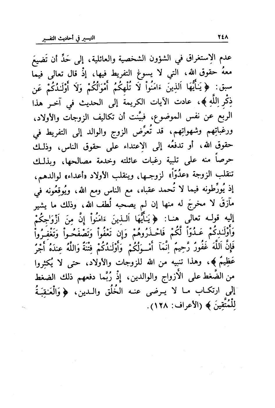 عدم الاستغراق في الشؤون الشخصية والعائلية، إلى حد أن تضيع معه حقوق الله، التي لا يسوغ التفريط فيها، إذ قال تعالى فيما سبق: {يَا أَيُّهَا الَّذِينَ آمَنُوا لَا تُلْهِكُمْ أَمْوَالُكُمْ وَلَا أَوْلَادُكُمْ عَنْ ذِكْرِ اللَّهِ}، عادت الآيات الكريمة إلى الحديث في آخر هذا الربع عن نفس الموضوع، فبينت أن تكاليف الزوجات والأولاد، ورغباتهم وشهواتهم، قد تعرض الزوج والوالد إلى التفريط في حقوق الله، أو تدفعه إلى الاعتداء على حقوق الناس، وذلك حرصا منه على تلبية رغبات عائلته وخدمة مصالحها، وبذلك تنقلب الزوجة " عدوا " لزوجها، وينقلب الأولاد " أعداء " لوالدهم، إذ يورطونه فيما لا تحمد عقباه، مع الناس ومع الله، ويوقعونه في مآزق لا مخرج له منها إن لم يصحبه لطف الله، وذلك ما يشير إليه قوله تعالى: {يَا أَيُّهَا الَّذِينَ آمَنُوا إِنَّ مِنْ أَزْوَاجِكُمْ وَأَوْلَادِكُمْ عَدُوًّا لَكُمْ فَاحْذَرُوهُمْ وَإِنْ تَعْفُوا وَتَصْفَحُوا وَتَغْفِرُوا فَإِنَّ اللَّهَ غَفُورٌ رَحِيمٌ * إِنَّمَا أَمْوَالُكُمْ وَأَوْلَادُكُمْ فِتْنَةٌ وَاللَّهُ عِنْدَهُ أَجْرٌ عَظِيمٌ}، وهذا تنبيه من الله للزوجات والأولاد، حتى لا يكثروا من الضغط على الأزواج والوالدين، إذ ربما دفعهم ذلك الضغط إلى ارتكاب ما لا يرضى عنه الخلق والدين، {وَالْعَاقِبَةُ لِلْمُتَّقِينَ} (الأعراف: 128).