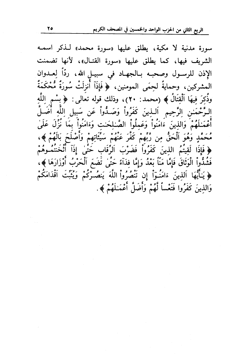 سورة مدنية لا مكية، يطلق عليها " سورة محمد " لذكر اسمه الشريف فيها، كما يطلق عليها " سورة القتال " لأنها تضمنت الإذن للرسول وصحبه بالجهاد في سبيل الله، ردا لعدوان المشركين، وحماية لحمى المؤمنين، {فَإِذَا أُنْزِلَتْ سُورَةٌ مُحْكَمَةٌ وَذُكِرَ فِيهَا الْقِتَالُ} (محمد: 20)، وذلك قوله تعالى: {بسم الله الرحمن الرحيم الَّذِينَ كَفَرُوا وَصَدُّوا عَنْ سَبِيلِ اللَّهِ أَضَلَّ أَعْمَالَهُمْ * وَالَّذِينَ آمَنُوا وَعَمِلُوا الصَّالِحَاتِ وَآمَنُوا بِمَا نُزِّلَ عَلَى مُحَمَّدٍ وَهُوَ الْحَقُّ مِنْ رَبِّهِمْ كَفَّرَ عَنْهُمْ سَيِّئَاتِهِمْ وَأَصْلَحَ بَالَهُمْ}، {فَإِذَا لَقِيتُمُ الَّذِينَ كَفَرُوا فَضَرْبَ الرِّقَابِ حَتَّى إِذَا أَثْخَنْتُمُوهُمْ فَشُدُّوا الْوَثَاقَ فَإِمَّا مَنًّا بَعْدُ وَإِمَّا فِدَاءً حَتَّى تَضَعَ الْحَرْبُ أَوْزَارَهَا}، {يَا أَيُّهَا الَّذِينَ آمَنُوا إِنْ تَنْصُرُوا اللَّهَ يَنْصُرْكُمْ وَيُثَبِّتْ أَقْدَامَكُمْ * وَالَّذِينَ كَفَرُوا فَتَعْسًا لَهُمْ وَأَضَلَّ أَعْمَالَهُمْ}.