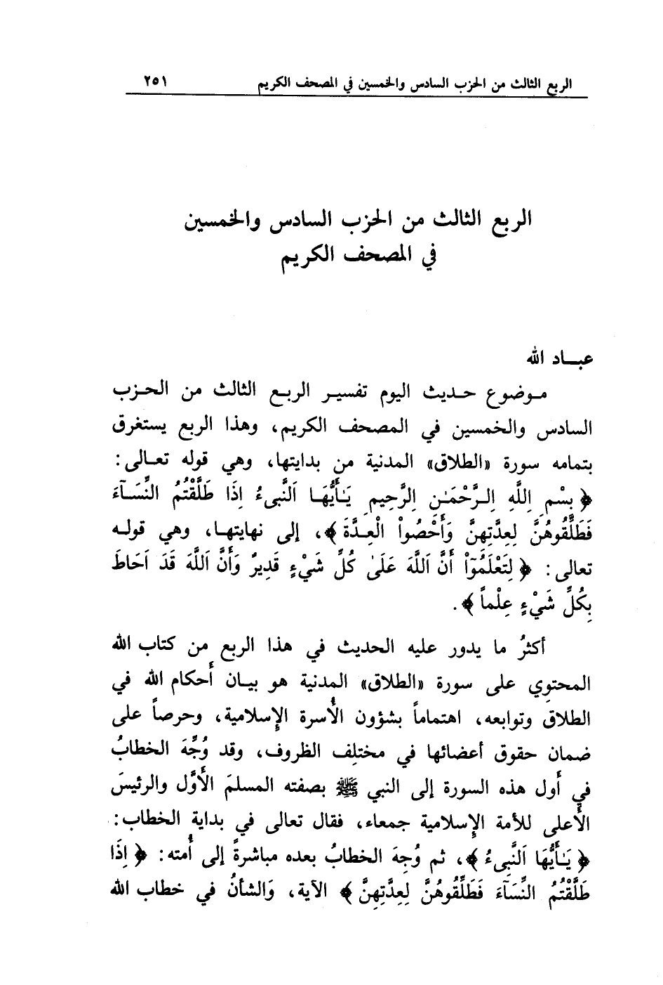 موضوع حديث اليوم تفسير الربع الثالث من الحزب السادس والخمسين في المصحف الكريم، وهذا الربع يستغرق بتمامه سورة "الطلاق" المدنية من بدايتها، وهي قوله تعالى: {بسم الله الرحمن الرحيم يَا أَيُّهَا النَّبِيُّ إِذَا طَلَّقْتُمُ النِّسَاءَ فَطَلِّقُوهُنَّ لِعِدَّتِهِنَّ وَأَحْصُوا الْعِدَّةَ}، إلى نهايتها، وهي قوله تعالى: {لِتَعْلَمُوا أَنَّ اللَّهَ عَلَى كُلِّ شَيْءٍ قَدِيرٌ وَأَنَّ اللَّهَ قَدْ أَحَاطَ بِكُلِّ شَيْءٍ عِلْمًا}.