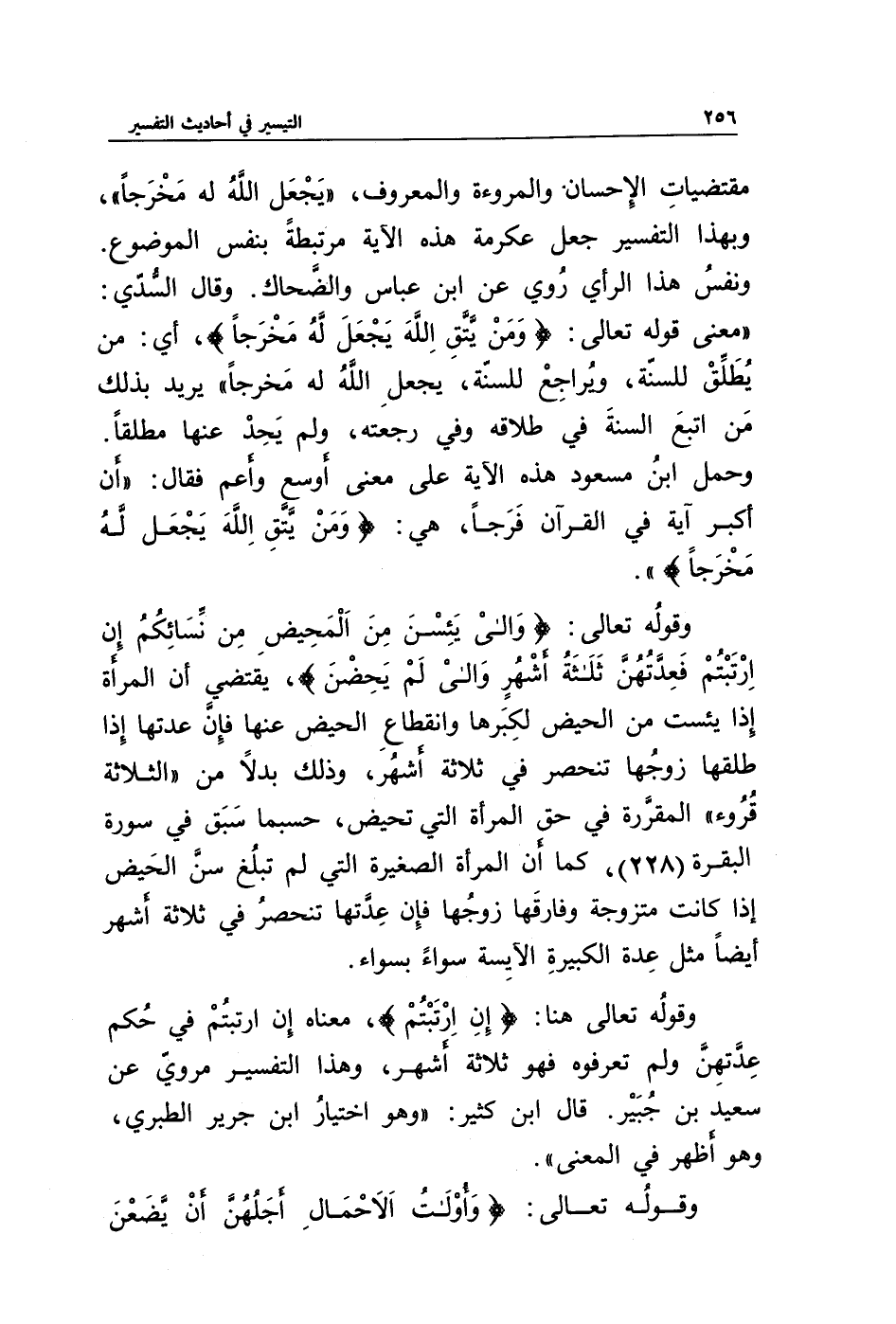 مقتضيات الإحسان والمروءة والمعروف، " يجعل الله له مخرجا "، وبهذا التفسير جعل عكرمة هذه الآية مرتبطة بنفس الموضوع. ونفس هذا الرأي روي عن ابن عباس والضحاك. وقال السدي: " معنى قوله تعالى: {وَمَنْ يَتَّقِ اللَّهَ يَجْعَلْ لَهُ مَخْرَجًا}، أي: من يطلق للسنة، ويراجع للسنة، يجعل الله له مخرجا " يريد بذلك من اتبع السنة في طلاقه وفي رجعته، ولم يحد عنها مطلقا. وحمل ابن مسعود هذه الآية على معنى أوسع وأعم فقال: " أن أكبر آية في القرآن فرجا، هي: {وَمَنْ يَتَّقِ اللَّهَ يَجْعَلْ لَهُ مَخْرَجًا}.