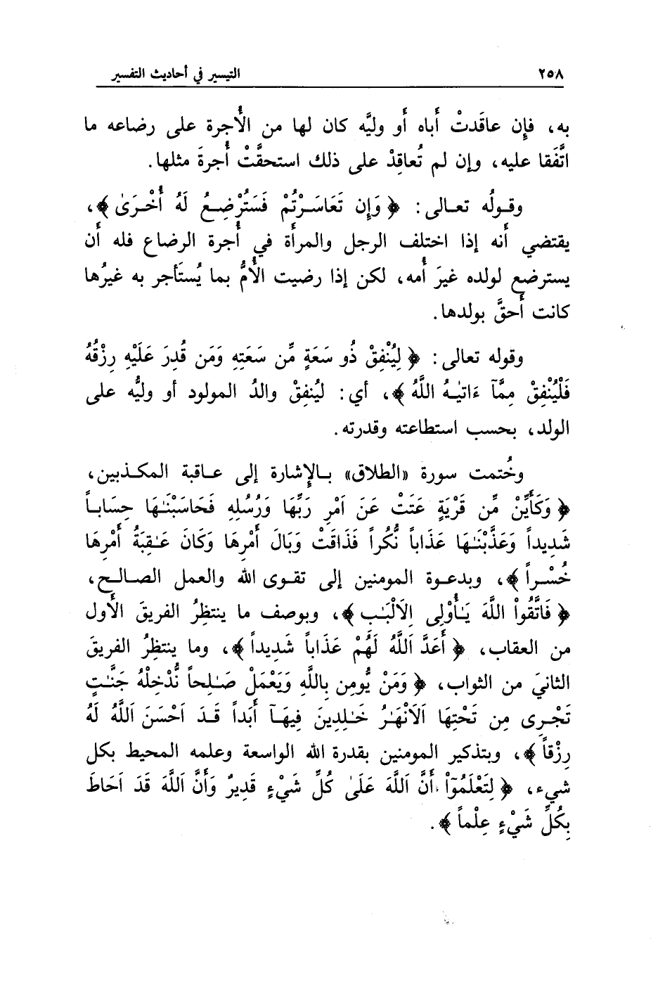 وخُتمت سورة " الطلاق " بالإشارة إلى عاقبة المكذبين، {وَكَأَيِّنْ مِنْ قَرْيَةٍ عَتَتْ عَنْ أَمْرِ رَبِّهَا وَرُسُلِهِ فَحَاسَبْنَاهَا حِسَابًا شَدِيدًا وَعَذَّبْنَاهَا عَذَابًا نُكْرًا * فَذَاقَتْ وَبَالَ أَمْرِهَا وَكَانَ عَاقِبَةُ أَمْرِهَا خُسْرًا}، وبدعوة المؤمنين إلى تقوى الله والعمل الصالح، {فَاتَّقُوا اللَّهَ يَا أُولِي الْأَلْبَابِ} وبوصف ما ينتظر الفريق الأول من العقاب، {أَعَدَّ اللَّهُ لَهُمْ عَذَابًا شَدِيدًا}، وما ينتظر الفريق الثاني من الثواب، {وَمَنْ يُؤْمِنْ بِاللَّهِ وَيَعْمَلْ صَالِحًا يُدْخِلْهُ جَنَّاتٍ تَجْرِي مِنْ تَحْتِهَا الْأَنْهَارُ خَالِدِينَ فِيهَا أَبَدًا قَدْ أَحْسَنَ اللَّهُ لَهُ رِزْقًا}، وبتذكير المؤمنين بقدرة الله الواسعة وعلمه المحيط بكل شيء، {لِتَعْلَمُوا أَنَّ اللَّهَ عَلَى كُلِّ شَيْءٍ قَدِيرٌ وَأَنَّ اللَّهَ قَدْ أَحَاطَ بِكُلِّ شَيْءٍ عِلْمًا}.