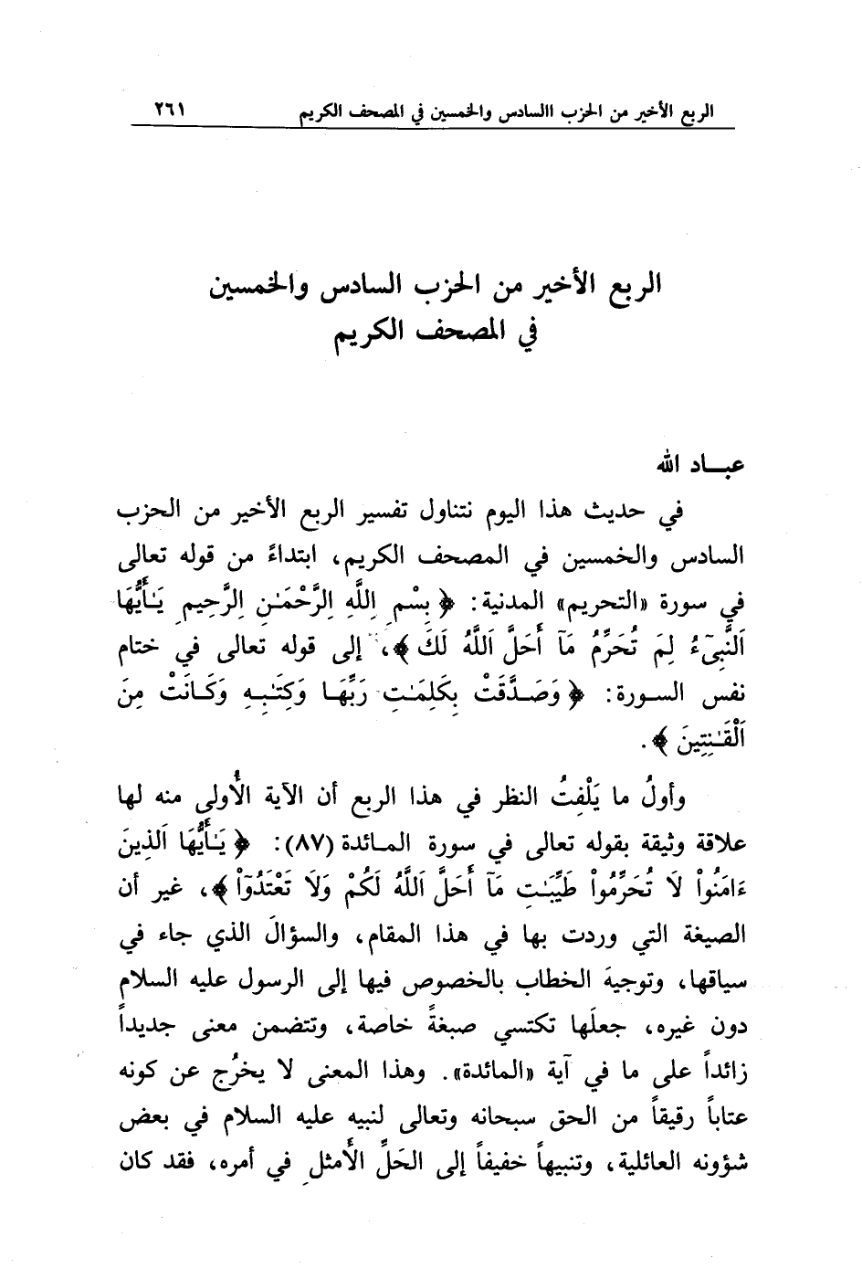 في حديث هذا اليوم نتناول تفسير الربع الأخير من الحزب السادس والخمسين في المصحف الكريم، ابتداء من قوله في سورة "التحريم" المدنية: {بسم الله الرحمن الرحيم يَا أَيُّهَا النَّبِيُّ لِمَ تُحَرِّمُ مَا أَحَلَّ اللَّهُ لَكَ}، إلى قوله تعالى في ختام نفس السورة: {وَصَدَّقَتْ بِكَلِمَاتِ رَبِّهَا وَكُتُبِهِ وَكَانَتْ مِنَ الْقَانِتِينَ}
