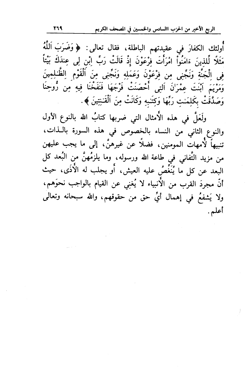 ولعل في هذه الأمثال التي ضربها كتاب الله بالنوع الأول والنوع الثاني من النساء بالخصوص في هذه السورة بالذات، تنبيها لأمهات المؤمنين، فضلا عن غيرهن، إلى ما يجب عليهن من مزيد التفاني في طاعة الله ورسوله، وما يلزمهن من البعد كل البعد عن كل ما ينغص عليه العيش، أو يجلب له الأذى، حيث أن مجرد القرب من الأنبياء لا يغني عن القيام بالواجب نحوهم، ولا يشفع في إهمال أي حق من حقوقهم، والله سبحانه وتعالى أعلم.