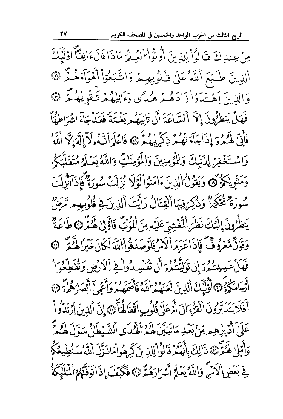 مِنْ عِنْدِكَ قَالُوا لِلَّذِينَ أُوتُوا الْعِلْمَ مَاذَا قَالَ آنِفًا أُولَئِكَ الَّذِينَ طَبَعَ اللَّهُ عَلَى قُلُوبِهِمْ وَاتَّبَعُوا أَهْوَاءَهُمْ (16) وَالَّذِينَ اهْتَدَوْا زَادَهُمْ هُدًى وَآتَاهُمْ تَقْوَاهُمْ (17) فَهَلْ يَنْظُرُونَ إِلَّا السَّاعَةَ أَنْ تَأْتِيَهُمْ بَغْتَةً فَقَدْ جَاءَ أَشْرَاطُهَا فَأَنَّى لَهُمْ إِذَا جَاءَتْهُمْ ذِكْرَاهُمْ (18) فَاعْلَمْ أَنَّهُ لَا إِلَهَ إِلَّا اللَّهُ وَاسْتَغْفِرْ لِذَنْبِكَ وَلِلْمُؤْمِنِينَ وَالْمُؤْمِنَاتِ وَاللَّهُ يَعْلَمُ مُتَقَلَّبَكُمْ وَمَثْوَاكُمْ (19) وَيَقُولُ الَّذِينَ آمَنُوا لَوْلَا نُزِّلَتْ سُورَةٌ فَإِذَا أُنْزِلَتْ سُورَةٌ مُحْكَمَةٌ وَذُكِرَ فِيهَا الْقِتَالُ رَأَيْتَ الَّذِينَ فِي قُلُوبِهِمْ مَرَضٌ يَنْظُرُونَ إِلَيْكَ نَظَرَ الْمَغْشِيِّ عَلَيْهِ مِنَ الْمَوْتِ فَأَوْلَى لَهُمْ (20) طَاعَةٌ وَقَوْلٌ مَعْرُوفٌ فَإِذَا عَزَمَ الْأَمْرُ فَلَوْ صَدَقُوا اللَّهَ لَكَانَ خَيْرًا لَهُمْ (21) فَهَلْ عَسَيْتُمْ إِنْ تَوَلَّيْتُمْ أَنْ تُفْسِدُوا فِي الْأَرْضِ وَتُقَطِّعُوا أَرْحَامَكُمْ (22) أُولَئِكَ الَّذِينَ لَعَنَهُمُ اللَّهُ فَأَصَمَّهُمْ وَأَعْمَى أَبْصَارَهُمْ (23) أَفَلَا يَتَدَبَّرُونَ الْقُرْآنَ أَمْ عَلَى قُلُوبٍ أَقْفَالُهَا (24) إِنَّ الَّذِينَ ارْتَدُّوا عَلَى أَدْبَارِهِمْ مِنْ بَعْدِ مَا تَبَيَّنَ لَهُمُ الْهُدَى الشَّيْطَانُ سَوَّلَ لَهُمْ وَأَمْلَى لَهُمْ (25) ذَلِكَ بِأَنَّهُمْ قَالُوا لِلَّذِينَ كَرِهُوا مَا نَزَّلَ اللَّهُ سَنُطِيعُكُمْ فِي بَعْضِ الْأَمْرِ وَاللَّهُ يَعْلَمُ إِسْرَارَهُمْ (26) فَكَيْفَ إِذَا تَوَفَّتْهُمُ الْمَلَائِكَةُ