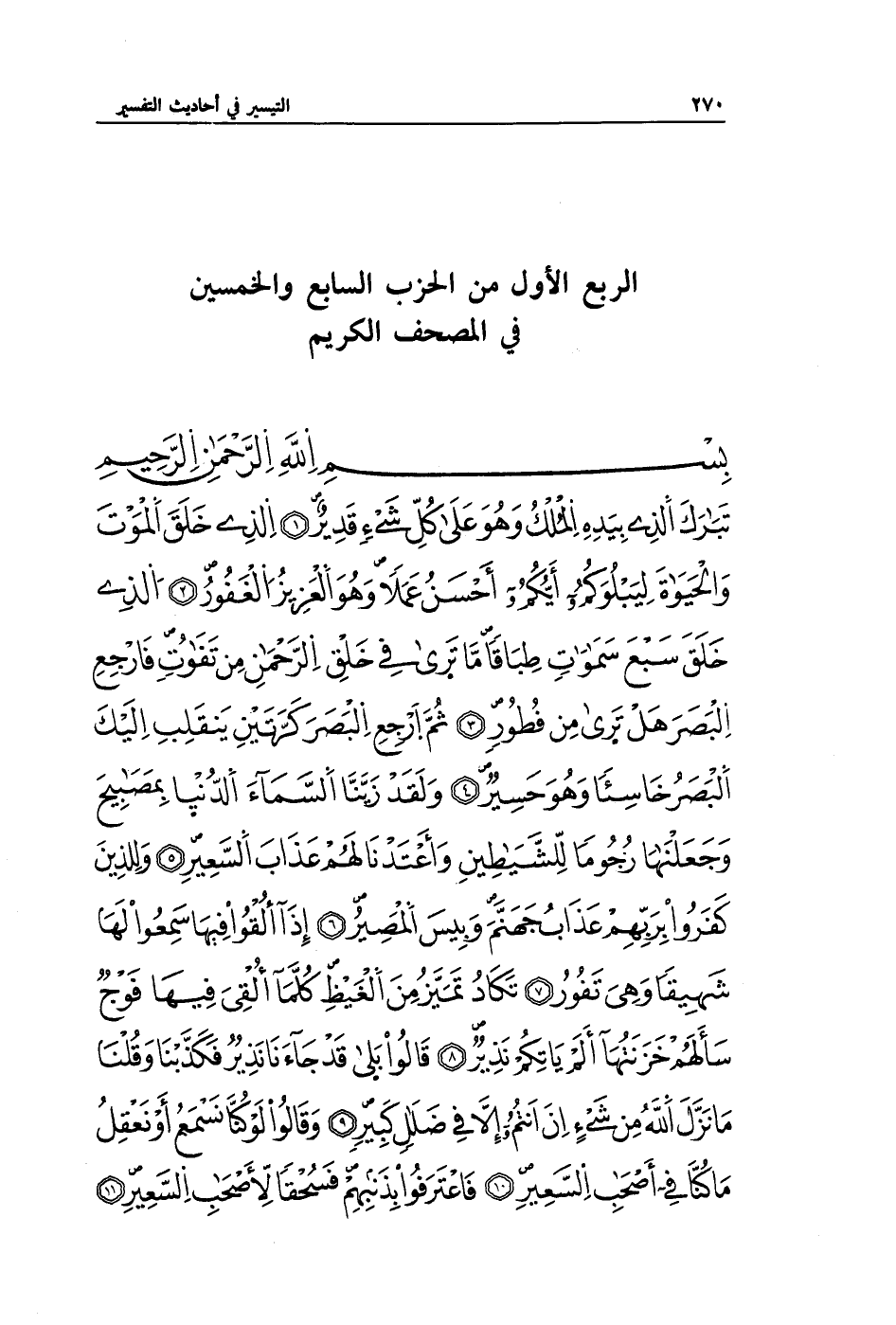 تَبَارَكَ الَّذِي بِيَدِهِ الْمُلْكُ وَهُوَ عَلَى كُلِّ شَيْءٍ قَدِيرٌ (1) الَّذِي خَلَقَ الْمَوْتَ وَالْحَيَاةَ لِيَبْلُوَكُمْ أَيُّكُمْ أَحْسَنُ عَمَلًا وَهُوَ الْعَزِيزُ الْغَفُورُ (2) الَّذِي خَلَقَ سَبْعَ سَمَاوَاتٍ طِبَاقًا مَا تَرَى فِي خَلْقِ الرَّحْمَنِ مِنْ تَفَاوُتٍ فَارْجِعِ الْبَصَرَ هَلْ تَرَى مِنْ فُطُورٍ (3) ثُمَّ ارْجِعِ الْبَصَرَ كَرَّتَيْنِ يَنْقَلِبْ إِلَيْكَ الْبَصَرُ خَاسِئًا وَهُوَ حَسِيرٌ (4) وَلَقَدْ زَيَّنَّا السَّمَاءَ الدُّنْيَا بِمَصَابِيحَ وَجَعَلْنَاهَا رُجُومًا لِلشَّيَاطِينِ وَأَعْتَدْنَا لَهُمْ عَذَابَ السَّعِيرِ (5) وَلِلَّذِينَ كَفَرُوا بِرَبِّهِمْ عَذَابُ جَهَنَّمَ وَبِئْسَ الْمَصِيرُ (6) إِذَا أُلْقُوا فِيهَا سَمِعُوا لَهَا شَهِيقًا وَهِيَ تَفُورُ (7) تَكَادُ تَمَيَّزُ مِنَ الْغَيْظِ كُلَّمَا أُلْقِيَ فِيهَا فَوْجٌ سَأَلَهُمْ خَزَنَتُهَا أَلَمْ يَأْتِكُمْ نَذِيرٌ (8) قَالُوا بَلَى قَدْ جَاءَنَا نَذِيرٌ فَكَذَّبْنَا وَقُلْنَا مَا نَزَّلَ اللَّهُ مِنْ شَيْءٍ إِنْ أَنْتُمْ إِلَّا فِي ضَلَالٍ كَبِيرٍ (9) وَقَالُوا لَوْ كُنَّا نَسْمَعُ أَوْ نَعْقِلُ مَا كُنَّا فِي أَصْحَابِ السَّعِيرِ (10) فَاعْتَرَفُوا بِذَنْبِهِمْ فَسُحْقًا لِأَصْحَابِ السَّعِيرِ (11)