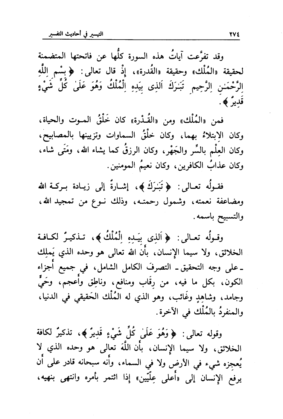 فمن " الملك " ومن " القدرة " كان خلق الموت والحياة، وكان الابتلاء بهما، وكان خلق السماوات وتزيينها بالمصابيح، وكان العلم بالسر والجهر، وكان الرزق كما يشاء الله، ومتى شاء، وكان عذاب الكافرين، وكان نعيم المؤمنين.