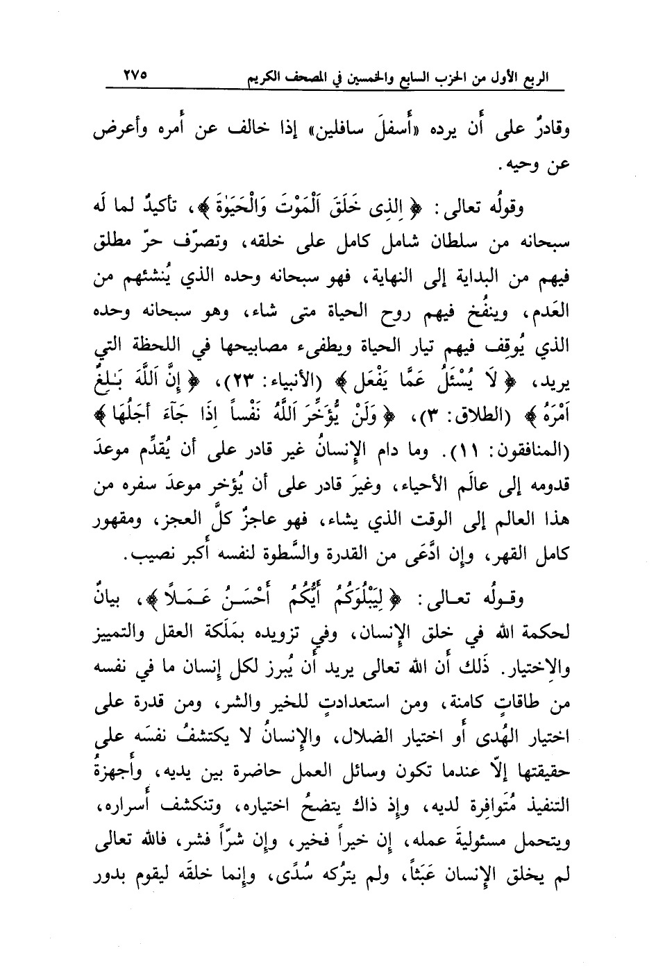 وقوله تعالى: {لِيَبْلُوَكُمْ أَيُّكُمْ أَحْسَنُ عَمَلًا}، بيان لحكمة الله في خلق الإنسان، وفي تزويده بملكة العقل والتمييز والاختيار، ذلك أن الله تعالى يريد أن يبرز لكل إنسان ما في نفسه من طاقات كامنة، ومن استعدادات للخير والشر، ومن قدرة على اختيار الهدى أو اختيار الضلال، والإنسان لا يكتشف نفسه على حقيقتها إلا عندما تكون وسائل العمل حاضرة بين يديه، وأجهزة التنفيذ متوافرة لديه، وإذ ذاك يتضح اختياره، وتنكشف أسراره، ويتحمل مسؤولية عمله، إن خيرا فخير، وإن شرا فشر، فالله تعالى لم يخلق الإنسان عبثا، ولم يتركه سدى، وإنما خلقه ليقوم بدور