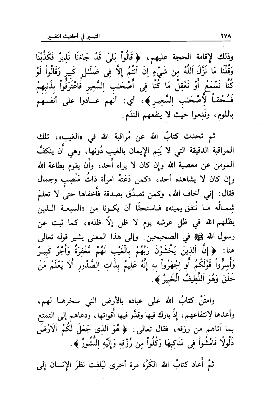 ثم تحدث كتاب الله عن مراقبة الله في " الغيب "، تلك المراقبة الدقيقة التي لا يتم الإيمان بالغيب دونها، وهي أن ينكفّ المؤمن عن معصية الله، وإن كان لا يراه أحد، وأن يقوم بطاعة الله، وإن كان لا يشاهده أحد، " كمن دعته امرأة ذات منصب وجمال فقال: إني أخاف الله، وكمن تصدق بصدقة فأخفاها حتى لا تعلم شماله ما تنفق يمينه " فاستحقا أن يكونا من " السبعة الذين يظللهم الله في ظل عرشه يوم لا ظل إلا ظله "، كما ثبت عن رسول الله صلى الله عليه وسلم في الصحيحين. وإلى هذا المعنى يشير قوله تعالى هنا: {إِنَّ الَّذِينَ يَخْشَوْنَ رَبَّهُمْ بِالْغَيْبِ لَهُمْ مَغْفِرَةٌ وَأَجْرٌ كَبِيرٌ * وَأَسِرُّوا قَوْلَكُمْ أَوِ اجْهَرُوا بِهِ إِنَّهُ عَلِيمٌ بِذَاتِ الصُّدُورِ * أَلَا يَعْلَمُ مَنْ خَلَقَ وَهُوَ اللَّطِيفُ الْخَبِيرُ}.