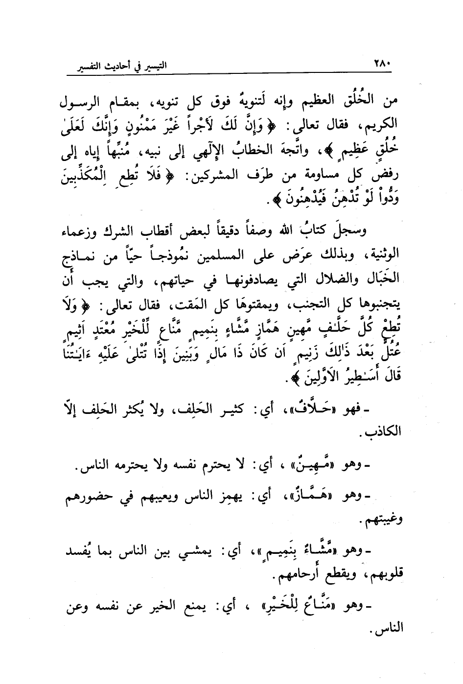 وسجل كتاب الله وصفا دقيقا لبعض أقطاب الشرك وزعماء الوثنية، وبذلك عرض على المسلمين نموذجا حيا من نماذج الخبال والضلال التي يصادفونها في حياتهم، والتي يجب أن يتجنبوها كل التجنب، ويمقتوها كل المقت، فقال تعالى: {وَلَا تُطِعْ كُلَّ حَلَّافٍ مَهِينٍ * هَمَّازٍ مَشَّاءٍ بِنَمِيمٍ * مَنَّاعٍ لِلْخَيْرِ مُعْتَدٍ أَثِيمٍ * عُتُلٍّ بَعْدَ ذَلِكَ زَنِيمٍ * أَنْ كَانَ ذَا مَالٍ وَبَنِينَ * إِذَا تُتْلَى عَلَيْهِ آيَاتُنَا قَالَ أَسَاطِيرُ الْأَوَّلِينَ}.