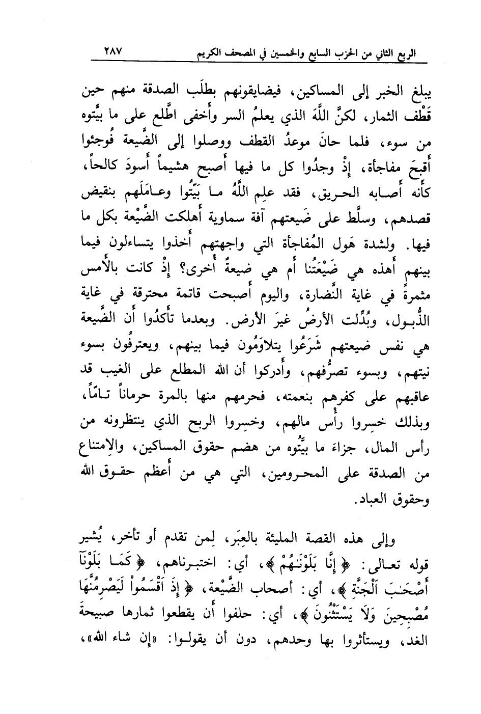 وإلى هذه القصة المليئة بالعبر، لمن تقدم أو تأخر، يشير قوله تعالى: {إِنَّا بَلَوْنَاهُمْ}، أي: اختبرناهم، {كَمَا بَلَوْنَا أَصْحَابَ الْجَنَّةِ}، أي: أصحاب الضيعة، {إِذْ أَقْسَمُوا لَيَصْرِمُنَّهَا مُصْبِحِينَ * وَلَا يَسْتَثْنُونَ}، أي: حلفوا أن يقطعوا ثمارها صبيحة الغد، ويستأثروا بها وحدهم، دون أن يقولوا: " إن شاء الله "،