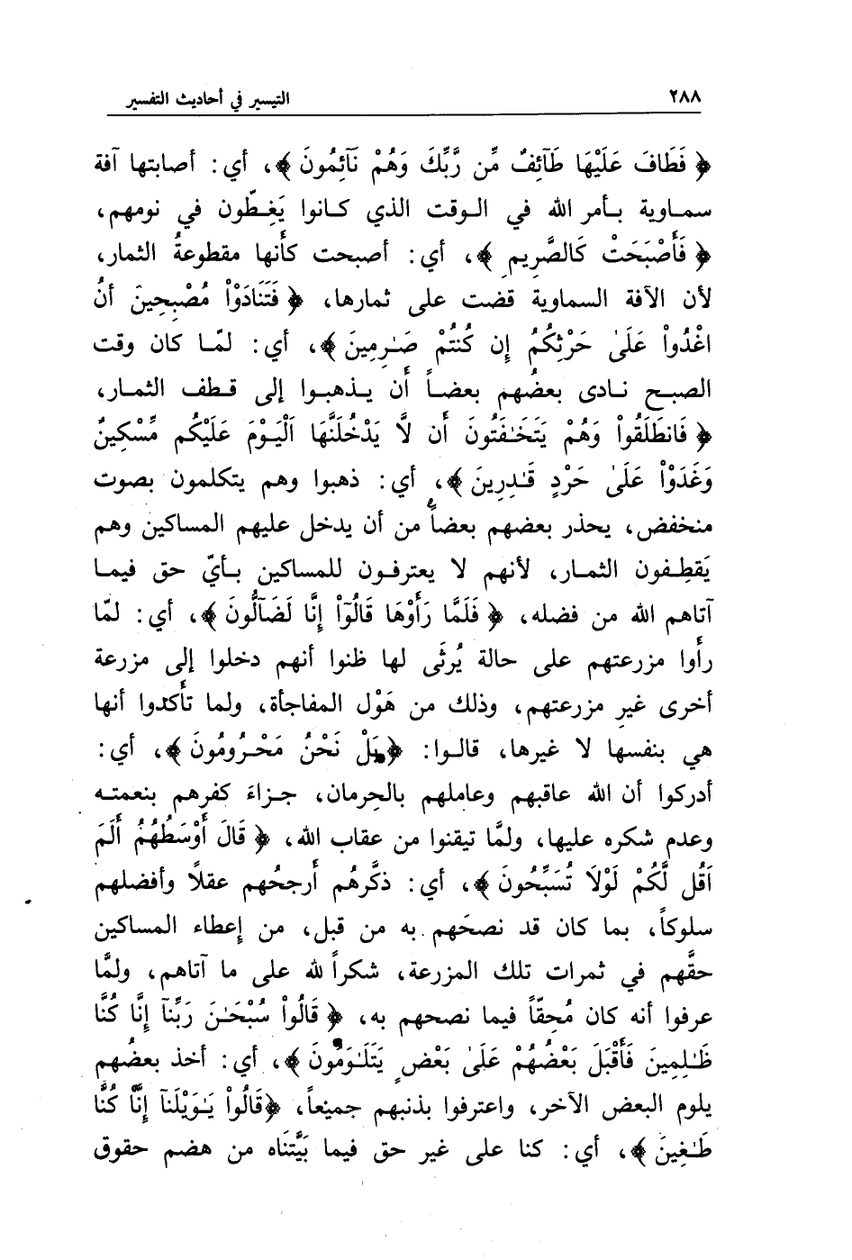 {فَطَافَ عَلَيْهَا طَائِفٌ مِنْ رَبِّكَ وَهُمْ نَائِمُونَ}، أي: أصابتها آفة سماوية بأمر الله في الوقت الذي كانوا يغطّون في نومهم، {فَأَصْبَحَتْ كَالصَّرِيمِ}، أي: أصبحت كأنها مقطوعة الثمار، لأن الآفة السماوية قضت على ثمارها، {فَتَنَادَوْا مُصْبِحِينَ * أَنِ اغْدُوا عَلَى حَرْثِكُمْ إِنْ كُنْتُمْ صَارِمِينَ}، أي: لما كان وقت الصبح، نادى بعضهم بعضا أن يذهبوا إلى قطف الثمار، {فَانْطَلَقُوا وَهُمْ يَتَخَافَتُونَ * أَنْ لَا يَدْخُلَنَّهَا الْيَوْمَ عَلَيْكُمْ مِسْكِينٌ * وَغَدَوْا عَلَى حَرْدٍ قَادِرِينَ}، أي: ذهبوا وهم يتكلمون بصوت منخفض، يحذر بعضهم بعضا من أن يدخل عليهم المساكين وهم يقطفون الثمار، لأنهم لا يعترفون للمساكين بأي حق فيما آتاهم الله من فضله، {فَلَمَّا رَأَوْهَا قَالُوا إِنَّا لَضَالُّونَ}، أي: لمّا رأوا مزرعتهم على حالة يرثى لها، ظنوا أنهم دخلوا إلى مزرعة أخرى غير مزرعتهم، وذلك من هول المفاجأة، ولمّا تأكدوا أنها هي بنفسها لا غيرها، قالوا: {بَلْ نَحْنُ مَحْرُومُونَ}، أي: أدركوا أن الله عاقبهم وعاملهم بالحرمان، جزاء كفرهم بنعمته وعدم شكره عليها، ولما تيقنوا من عقاب الله، {قَالَ أَوْسَطُهُمْ أَلَمْ أَقُلْ لَكُمْ لَوْلَا تُسَبِّحُونَ}، أي: ذكرهم أرجحهم عقلا وأفضلهم سلوكا، بما كان قد نصحهم به من قبل، من إعطاء المساكين حقهم في ثمرات تلك المزرعة، شكرا لله على ما آتاهم، ولما عرفوا أنه كان محقا فيما نصحهم به، {قَالُوا سُبْحَانَ رَبِّنَا إِنَّا كُنَّا ظَالِمِينَ * فَأَقْبَلَ بَعْضُهُمْ عَلَى بَعْضٍ يَتَلَاوَمُونَ}، أي: أخذ بعضهم يلوم البعض الآخر، واعترفوا بذنبهم جميعا، {قَالُوا يَا وَيْلَنَا إِنَّا كُنَّا طَاغِينَ}، أي: كنا على غير حق فيما بيتناه من هضم حقوق