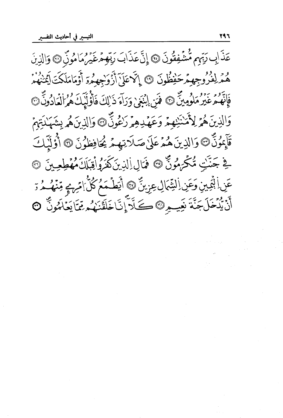 عَذَابِ رَبِّهِمْ مُشْفِقُونَ (27) إِنَّ عَذَابَ رَبِّهِمْ غَيْرُ مَأْمُونٍ (28) وَالَّذِينَ هُمْ لِفُرُوجِهِمْ حَافِظُونَ (29) إِلَّا عَلَى أَزْوَاجِهِمْ أَوْ مَا مَلَكَتْ أَيْمَانُهُمْ فَإِنَّهُمْ غَيْرُ مَلُومِينَ (30) فَمَنِ ابْتَغَى وَرَاءَ ذَلِكَ فَأُولَئِكَ هُمُ الْعَادُونَ (31) وَالَّذِينَ هُمْ لِأَمَانَاتِهِمْ وَعَهْدِهِمْ رَاعُونَ (32) وَالَّذِينَ هُمْ بِشَهَادَاتِهِمْ قَائِمُونَ (33) وَالَّذِينَ هُمْ عَلَى صَلَاتِهِمْ يُحَافِظُونَ (34) أُولَئِكَ فِي جَنَّاتٍ مُكْرَمُونَ (35) فَمَالِ الَّذِينَ كَفَرُوا قِبَلَكَ مُهْطِعِينَ (36) عَنِ الْيَمِينِ وَعَنِ الشِّمَالِ عِزِينَ (37) أَيَطْمَعُ كُلُّ امْرِئٍ مِنْهُمْ أَنْ يُدْخَلَ جَنَّةَ نَعِيمٍ (38) كَلَّا إِنَّا خَلَقْنَاهُمْ مِمَّا يَعْلَمُونَ (39)