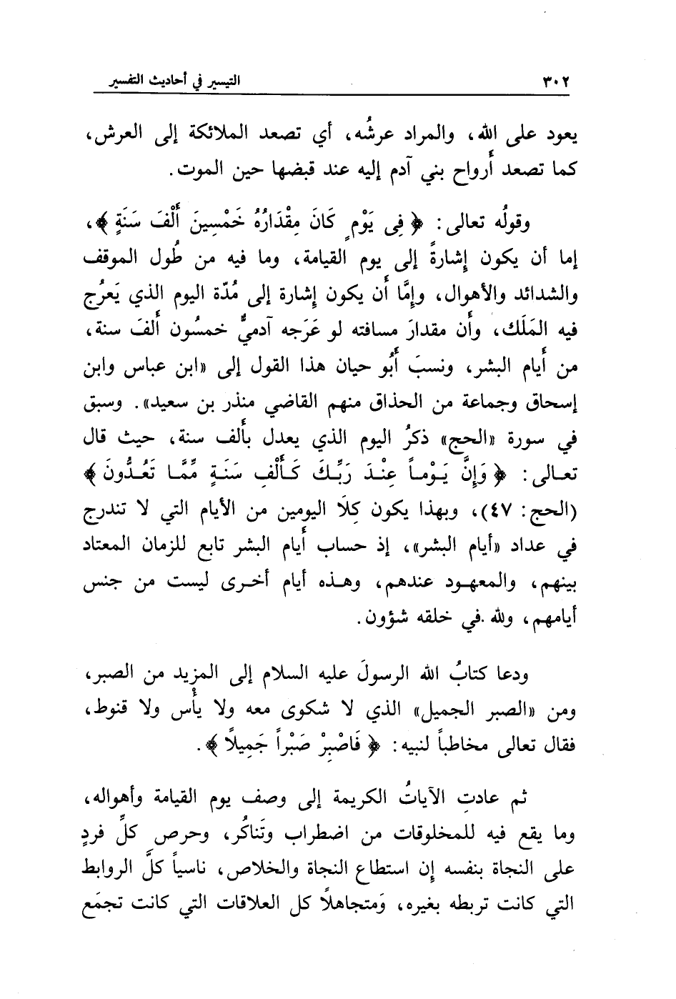 وقوله تعالى: {فِي يَوْمٍ كَانَ مِقْدَارُهُ خَمْسِينَ أَلْفَ سَنَةٍ}، إما أن يكون إشارة إلى يوم القيامة، وما فيه من طول الموقف والشدائد والأهوال، وإما أن يكون إشارة إلى مدة اليوم الذي يعرج فيه الملك، وأن مقدار مسافته لو عرجه آدمي خمسون ألف سنة، من أيام البشر، ونسب أبو حيان هذا القول إلى " ابن عباس وابن إسحاق وجماعة من الحذاق منهم القاضي منذر بن سعيد ". وسبق في سورة " الحج " ذكر اليوم الذي يعدل بألف سنة، حيث قال تعالى: {وَإِنَّ يَوْمًا عِنْدَ رَبِّكَ كَأَلْفِ سَنَةٍ مِمَّا تَعُدُّونَ} (الحج: 47)، وبهذا يكون كلا اليومين من الأيام التي تندرج في عداد " أيام البشر "، إذ حساب أيام البشر تابع للزمان المعتاد بينهم، والمعهود عندهم، وهذه أيام أخرى ليست من جنس أيامهم، ولله في خلقه شؤون.