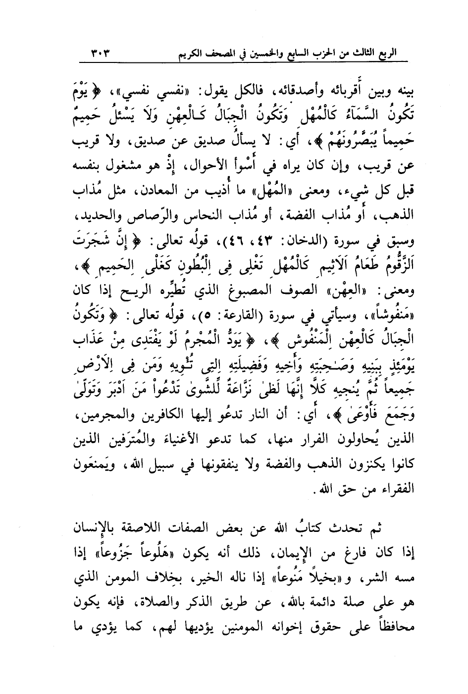 بينه وبين أقربائه وأصدقائه، فالكل يقول: " نفسي نفسي "، {يَوْمَ تَكُونُ السَّمَاءُ كَالْمُهْلِ * وَتَكُونُ الْجِبَالُ كَالْعِهْنِ * وَلَا يَسْأَلُ حَمِيمٌ حَمِيمًا * يُبَصَّرُونَهُمْ}، أي لا يسأل صديق عن صديق، ولا قريب عن قريب، وإن كان يراه في أسوأ الأحوال، إذ هو مشغول بنفسه قبل كل شيء، ومعنى " المهل " ما أذيب من المعادن، مثل مذاب الذهب، أو مذاب الفضة، أو مذاب النحاس والرصاص والحديد، وسبق في سورة (الدخان: 43، 46)، قوله تعالى: {إِنَّ شَجَرَتَ الزَّقُّومِ * طَعَامُ الْأَثِيمِ * كَالْمُهْلِ يَغْلِي فِي الْبُطُونِ * كَغَلْيِ الْحَمِيمِ}، ومعنى " العهن " الصوف المصبوغ الذي تطيره الريح إذا كان " منفوشا "، وسيأتي في سورة (القارعة: 5)، قوله تعالى: {وَتَكُونُ الْجِبَالُ كَالْعِهْنِ الْمَنْفُوشِ}، {يَوَدُّ الْمُجْرِمُ لَوْ يَفْتَدِي مِنْ عَذَابِ يَوْمِئِذٍ بِبَنِيهِ * وَصَاحِبَتِهِ وَأَخِيهِ * وَفَصِيلَتِهِ الَّتِي تُؤْوِيهِ * وَمَنْ فِي الْأَرْضِ جَمِيعًا ثُمَّ يُنْجِيهِ * كَلَّا إِنَّهَا لَظَى * نَزَّاعَةً لِلشَّوَى * تَدْعُو مَنْ أَدْبَرَ وَتَوَلَّى * وَجَمَعَ فَأَوْعَى}، أي أن النار تدعو إليها الكافرين والمجرمين، الذين يحاولون الفرار منها، كما تدعو الأغنياء والمترفين الذين كانوا يكنزون الذهب والفضة ولا ينفقونها في سبيل الله، ويمنعون الفقراء من حق الله.