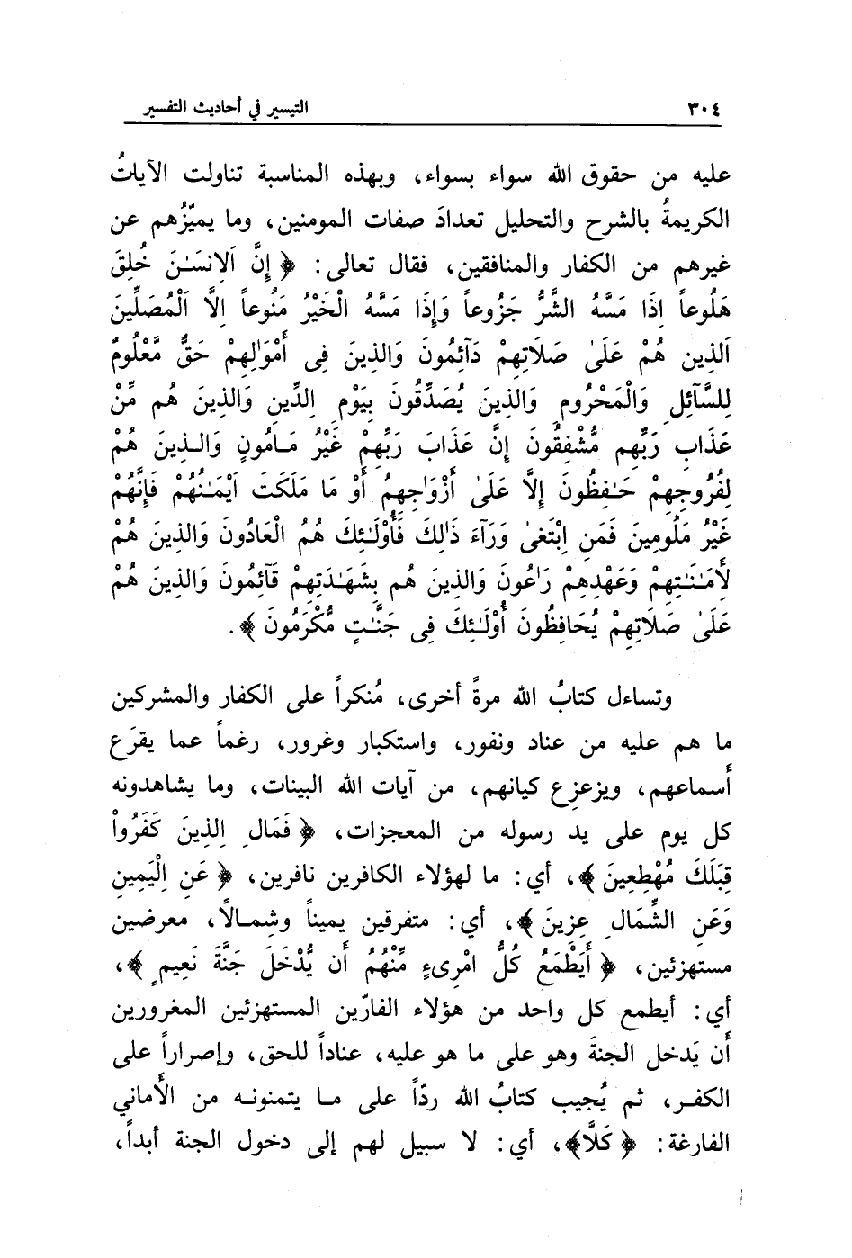 وتساءل كتاب الله مرة أخرى، منكرا على الكفار والمشركين ما هم عليه من عناد ونفور، واستكبار وغرور، رغما عما يقرع أسماعهم، ويزعزع كيانهم، من آيات الله البينات، وما يشاهدونه كل يوم على يد رسوله من المعجزات، {فَمَالِ الَّذِينَ كَفَرُوا قِبَلَكَ مُهْطِعِينَ}، أي: ما لهؤلاء الكافرين نافرين، {عَنِ الْيَمِينِ وَعَنِ الشِّمَالِ عِزِينَ}، أي متفرقين يمينا وشمالا، معرضين مستهزئين، {أَيَطْمَعُ كُلُّ امْرِئٍ مِنْهُمْ أَنْ يُدْخَلَ جَنَّةَ نَعِيمٍ}، أي: أيطمع كل واحد من هؤلاء الفارين المستهزئين المغرورين أن يدخل الجنة وهو على ما هو عليه، عنادا للحق، وإصرارا على الكفر، ثم يجيب الله ردا على ما يتمنونه من الأماني الفارغة، {كَلَّا}، أي لا سبيل لهم إلى دخول الجنة أبدا،