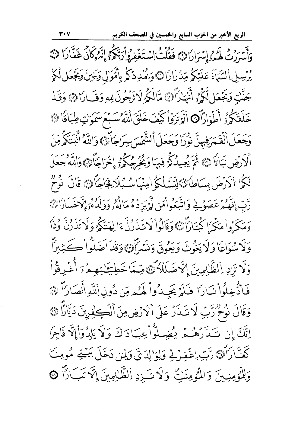 وَأَسْرَرْتُ لَهُمْ إِسْرَارًا (9) فَقُلْتُ اسْتَغْفِرُوا رَبَّكُمْ إِنَّهُ كَانَ غَفَّارًا (10) يُرْسِلِ السَّمَاءَ عَلَيْكُمْ مِدْرَارًا (11) وَيُمْدِدْكُمْ بِأَمْوَالٍ وَبَنِينَ وَيَجْعَلْ لَكُمْ جَنَّاتٍ وَيَجْعَلْ لَكُمْ أَنْهَارًا (12) مَا لَكُمْ لَا تَرْجُونَ لِلَّهِ وَقَارًا (13) وَقَدْ خَلَقَكُمْ أَطْوَارًا (14) أَلَمْ تَرَوْا كَيْفَ خَلَقَ اللَّهُ سَبْعَ سَمَاوَاتٍ طِبَاقًا (15) وَجَعَلَ الْقَمَرَ فِيهِنَّ نُورًا وَجَعَلَ الشَّمْسَ سِرَاجًا (16) وَاللَّهُ أَنْبَتَكُمْ مِنَ الْأَرْضِ نَبَاتًا (17) ثُمَّ يُعِيدُكُمْ فِيهَا وَيُخْرِجُكُمْ إِخْرَاجًا (18) وَاللَّهُ جَعَلَ لَكُمُ الْأَرْضَ بِسَاطًا (19) لِتَسْلُكُوا مِنْهَا سُبُلًا فِجَاجًا (20) قَالَ نُوحٌ رَبِّ إِنَّهُمْ عَصَوْنِي وَاتَّبَعُوا مَنْ لَمْ يَزِدْهُ مَالُهُ وَوَلَدُهُ إِلَّا خَسَارًا (21) وَمَكَرُوا مَكْرًا كُبَّارًا (22) وَقَالُوا لَا تَذَرُنَّ آلِهَتَكُمْ وَلَا تَذَرُنَّ وَدًّا وَلَا سُوَاعًا وَلَا يَغُوثَ وَيَعُوقَ وَنَسْرًا (23) وَقَدْ أَضَلُّوا كَثِيرًا وَلَا تَزِدِ الظَّالِمِينَ إِلَّا ضَلَالًا (24) مِمَّا خَطِيئَاتِهِمْ أُغْرِقُوا فَأُدْخِلُوا نَارًا فَلَمْ يَجِدُوا لَهُمْ مِنْ دُونِ اللَّهِ أَنْصَارًا (25) وَقَالَ نُوحٌ رَبِّ لَا تَذَرْ عَلَى الْأَرْضِ مِنَ الْكَافِرِينَ دَيَّارًا (26) إِنَّكَ إِنْ تَذَرْهُمْ يُضِلُّوا عِبَادَكَ وَلَا يَلِدُوا إِلَّا فَاجِرًا كَفَّارًا (27) رَبِّ اغْفِرْ لِي وَلِوَالِدَيَّ وَلِمَنْ دَخَلَ بَيْتِيَ مُؤْمِنًا وَلِلْمُؤْمِنِينَ وَالْمُؤْمِنَاتِ وَلَا تَزِدِ الظَّالِمِينَ إِلَّا تَبَارًا (28)