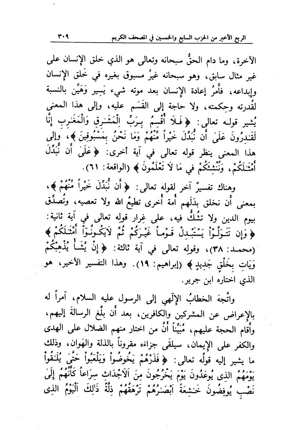 الآخرة، وما دام الحق سبحانه وتعالى هو الذي خلق الإنسان على غير مثال سابق، وهو سبحانه غير مسبوق بغيره في خلق الإنسان وإبداعه، فأمر إعادة الإنسان بعد موته شيء يسير وهين بالنسبة لقدرته وحكمته، ولا حاجة إلى القسم عليه، وإلى هذا المعنى يشير قوله تعالى: {فَلَا أُقْسِمُ بِرَبِّ الْمَشَارِقِ وَالْمَغَارِبِ إِنَّا لَقَادِرُونَ * عَلَى أَنْ نُبَدِّلَ خَيْرًا مِنْهُمْ وَمَا نَحْنُ بِمَسْبُوقِينَ}، وإلى هذا المعنى ينظر قوله تعالى في آية أخرى: {عَلَى أَنْ نُبَدِّلَ أَمْثَالَكُمْ وَنُنْشِئَكُمْ فِي مَا لَا تَعْلَمُونَ} (الواقعة: 61).