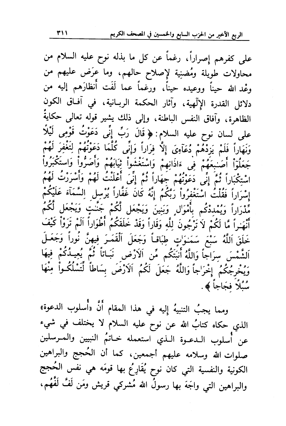 ومما يجب التنبيه إليه في هذا المقام أن " أسلوب الدعوة " الذي حكاه كتاب الله عن نوح عليه السلام لا يختلف في شيء عن أسلوب الدعوة الذي استعمله خاتم النبيين والمرسلين صلوات الله وسلامه عليهم أجمعين، كما أن الحجج والبراهين الكونية والنفسية التي كان نوح يقارع بها قومه هي نفس الحجج والبراهين التي واجه بها رسول الله مشركي قريش ومن لف لفهم،