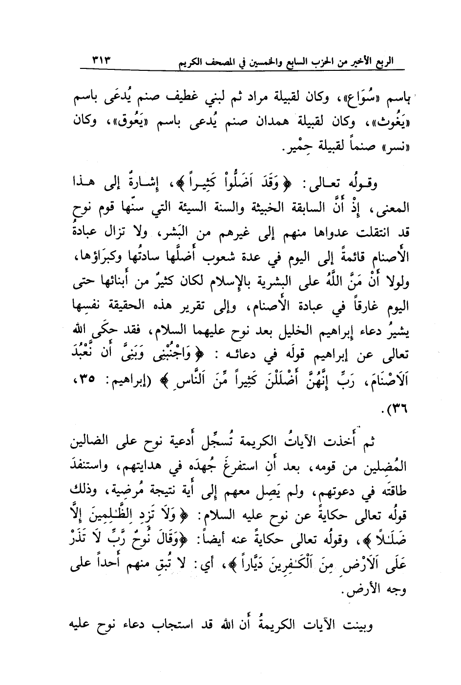 وقوله تعالى: {وَقَدْ أَضَلُّوا كَثِيرًا}، إشارة إلى هذا المعنى، إذ إن السابقة الخبيثة والسنة السيئة التي سنها قوم نوح قد انتقلت عدواها منهم إلى غيرهم من البشر، ولا تزال عبادة الأصنام قائمة إلى اليوم في عدة شعوب أضلها سادتها وكبراؤها، ولولا أن من الله على البشرية بالإسلام لكان كثير من أبنائها حتى اليوم غارقا في عبادة الأصنام، وإلى تقرير هذه الحقيقة نفسها يشير دعاء إبراهيم الخليل بعد نوح عليهما السلام، فقد حكى الله تعالى عن إبراهيم قوله في دعائه: {وَاجْنُبْنِي وَبَنِيَّ أَنْ نَعْبُدَ الْأَصْنَامَ * رَبِّ إِنَّهُنَّ أَضْلَلْنَ كَثِيرًا مِنَ النَّاسِ} (إبراهيم: 35، 36).