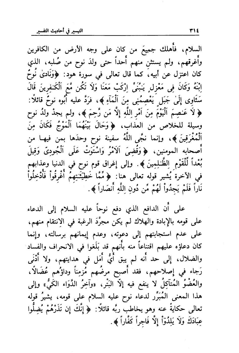على أن الدافع الذي دفع نوحا عليه السلام إلى الدعاء على قومه بالإبادة والهلاك لم يكن مجرد الرغبة في الانتقام منهم، على عدم استجابتهم إلى دعوته، وعدم إيمانهم برسالته، وإنما كان دعاؤه عليهم اقتناعا منه بأنهم قد بلغوا في الانحراف والفساد والضلال، إلى حد أنه لم يبق أي أمل في هدايتهم، ولا أدنى رجاء في إصلاحهم، فقد أصبح مرضهم مزمنا وداؤهم عضالا، والعضو المتآكل لا ينفع فيه إلا البتر، " وآخر الدواء الكي " وإلى هذا المعنى المبرر لدعاء نوح عليه السلام على قومه، يشير قوله تعالى حكاية عنه وهو يخاطب ربه قائلا: {إِنَّكَ إِنْ تَذَرْهُمْ يُضِلُّوا عِبَادَكَ وَلَا يَلِدُوا إِلَّا فَاجِرًا كَفَّارًا}.