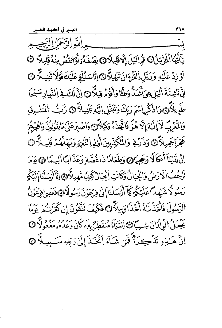 يَا أَيُّهَا الْمُزَّمِّلُ (1) قُمِ اللَّيْلَ إِلَّا قَلِيلًا (2) نِصْفَهُ أَوِ انْقُصْ مِنْهُ قَلِيلًا (3) أَوْ زِدْ عَلَيْهِ وَرَتِّلِ الْقُرْآنَ تَرْتِيلًا (4) إِنَّا سَنُلْقِي عَلَيْكَ قَوْلًا ثَقِيلًا (5) إِنَّ نَاشِئَةَ اللَّيْلِ هِيَ أَشَدُّ وَطْئًا وَأَقْوَمُ قِيلًا (6) إِنَّ لَكَ فِي النَّهَارِ سَبْحًا طَوِيلًا (7) وَاذْكُرِ اسْمَ رَبِّكَ وَتَبَتَّلْ إِلَيْهِ تَبْتِيلًا (8) رَبُّ الْمَشْرِقِ وَالْمَغْرِبِ لَا إِلَهَ إِلَّا هُوَ فَاتَّخِذْهُ وَكِيلًا (9) وَاصْبِرْ عَلَى مَا يَقُولُونَ وَاهْجُرْهُمْ هَجْرًا جَمِيلًا (10) وَذَرْنِي وَالْمُكَذِّبِينَ أُولِي النَّعْمَةِ وَمَهِّلْهُمْ قَلِيلًا (11) إِنَّ لَدَيْنَا أَنْكَالًا وَجَحِيمًا (12) وَطَعَامًا ذَا غُصَّةٍ وَعَذَابًا أَلِيمًا (13) يَوْمَ تَرْجُفُ الْأَرْضُ وَالْجِبَالُ وَكَانَتِ الْجِبَالُ كَثِيبًا مَهِيلًا (14) إِنَّا أَرْسَلْنَا إِلَيْكُمْ رَسُولًا شَاهِدًا عَلَيْكُمْ كَمَا أَرْسَلْنَا إِلَى فِرْعَوْنَ رَسُولًا (15) فَعَصَى فِرْعَوْنُ الرَّسُولَ فَأَخَذْنَاهُ أَخْذًا وَبِيلًا (16) فَكَيْفَ تَتَّقُونَ إِنْ كَفَرْتُمْ يَوْمًا يَجْعَلُ الْوِلْدَانَ شِيبًا (17) السَّمَاءُ مُنْفَطِرٌ بِهِ كَانَ وَعْدُهُ مَفْعُولًا (18) إِنَّ هَذِهِ تَذْكِرَةٌ فَمَنْ شَاءَ اتَّخَذَ إِلَى رَبِّهِ سَبِيلًا (19)