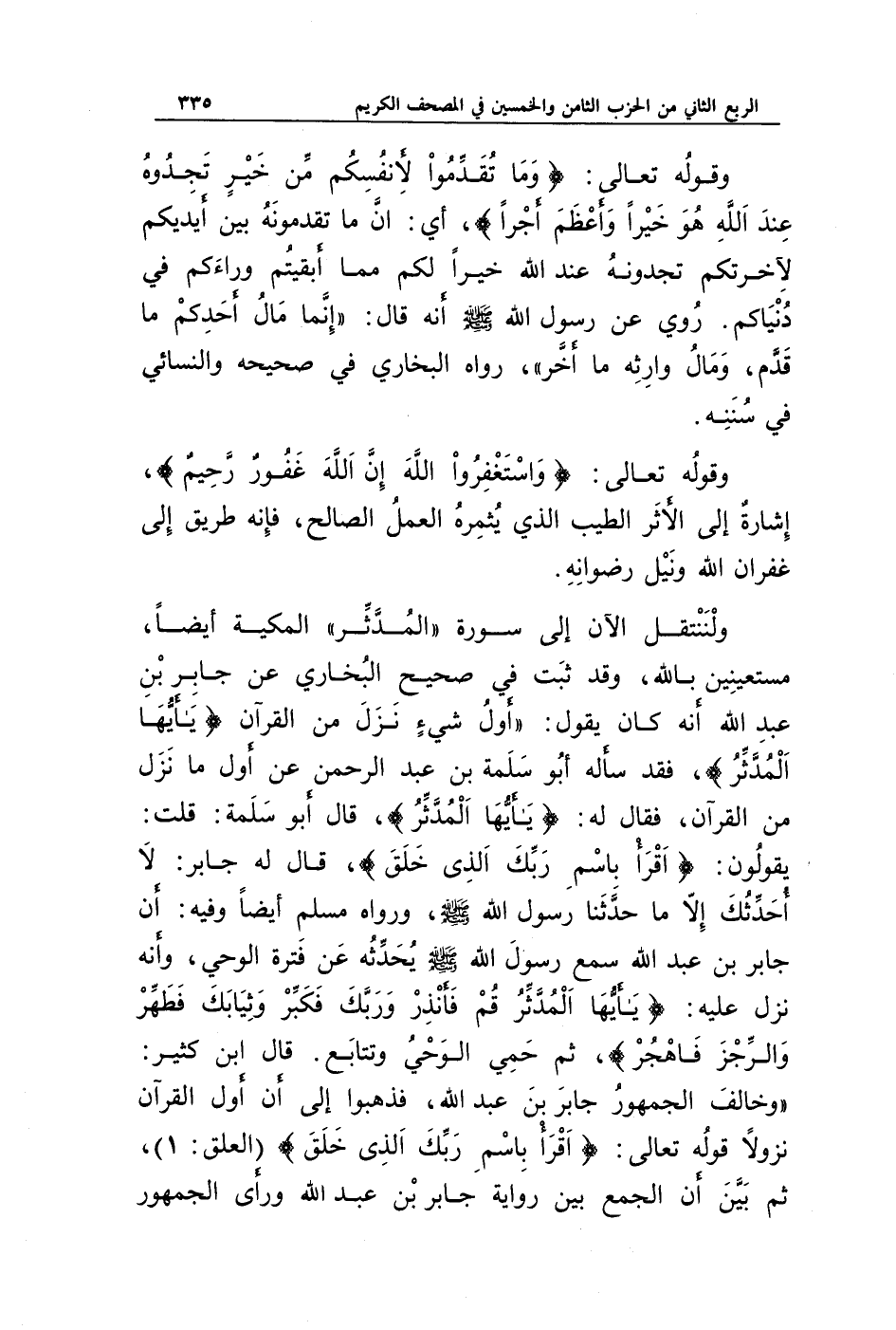 ولننتقل الآن إلى سورة " المدثر " المكية أيضا، مستعينين بالله، وقد ثبت في صحيح البخاري عن جابر بن عبد الله أنه كان يقول: " أول شيء نزل من القرآن {يَا أَيُّهَا الْمُدَّثِّرُ}، فقد سأله أبو سلمة بن عبد الرحمن عن أول ما نزل من القرآن، فقال له: {يَا أَيُّهَا الْمُدَّثِّرُ}، قال أبو سلمة: قلت: يقولون: {اقْرَأْ بِاسْمِ رَبِّكَ الَّذِي خَلَقَ}، قال له جابر: لا أحدثك إلا ما حدثنا رسول الله صلى الله عليه وسلم، ورواه مسلم أيضا وفيه: أن جابر بن عبد الله سمع رسول الله صلى الله عليه وسلم يحدثه عن فترة الوحي، وأنه نزل عليه: {يَا أَيُّهَا الْمُدَّثِّرُ * قُمْ فَأَنْذِرْ * وَرَبَّكَ فَكَبِّرْ * وَثِيَابَكَ فَطَهِّرْ * وَالرُّجْزَ فَاهْجُرْ}، ثم حمي الوحي وتتابع. قال ابن كثير: " وخالف الجمهور جابر بن عبد الله، فذهبوا إلى أن أول القرآن نزولا قوله تعالى: {اقْرَأْ بِاسْمِ رَبِّكَ الَّذِي خَلَقَ} (العلق: 1)، ثم بين أن الجمع بين رواية جابر بن عبد الله ورأي الجمهور