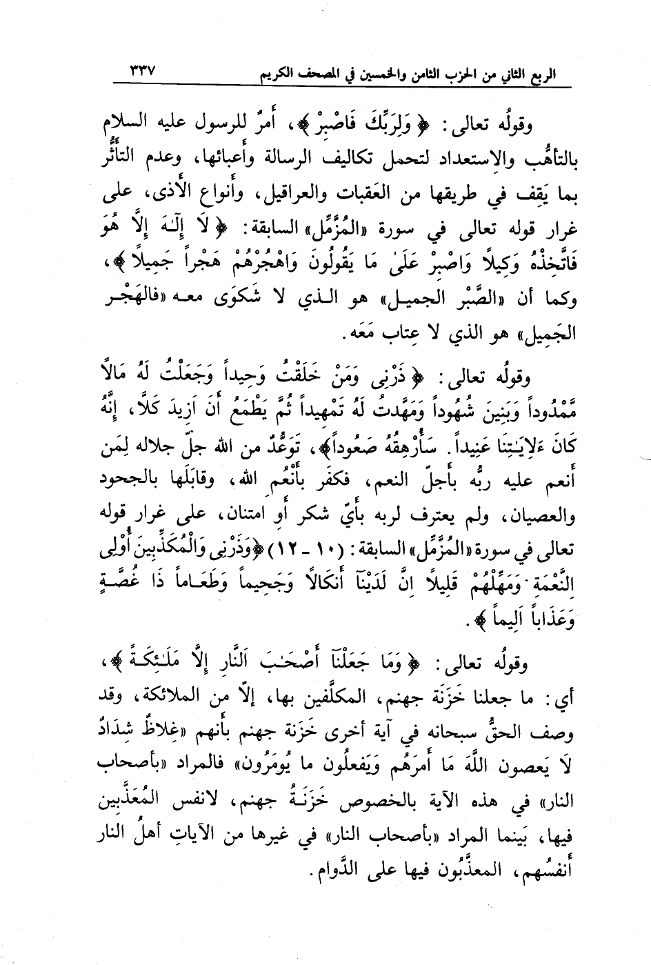 وقوله تعالى: {وَلِرَبِّكَ فَاصْبِرْ}، أمر للرسول عليه السلام بالتأهب والاستعداد لتحمل تكاليف الرسالة وأعباءها، وعدم التأثر بما يقف في طريقها من العقبات والعراقيل، وأنواع الأذى على غرار قوله تعالى في سورة " المزمل " السابقة: {لَا إِلَهَ إِلَّا هُوَ فَاتَّخِذْهُ وَكِيلًا * وَاصْبِرْ عَلَى مَا يَقُولُونَ وَاهْجُرْهُمْ هَجْرًا جَمِيلًا}، وكما أن " الصبر الجميل " هو الذي لا شكوى معه " فالهجر الجميل " هو الذي لا عتاب معه.
