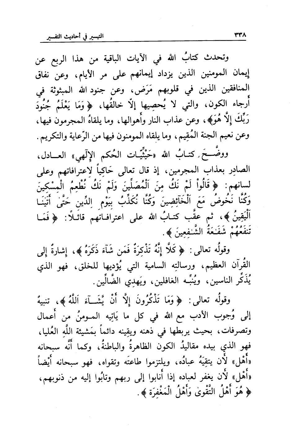 وتحدث كتاب الله في الآيات الباقية من هذا الربع عن إيمان المؤمنين الذين يزداد إيمانهم على مر الأيام، وعن نفاق المنافقين الذين في قلوبهم مرض، وعن جنود الله المبثوثة في أرجاء الكون، والتي لا يحصيها إلا خالقها، {وَمَا يَعْلَمُ جُنُودَ رَبِّكَ إِلَّا هُوَ}، وعن عذاب النار وأهوالها، وما يلقاه المجرمون فيها، وعن نعيم الجنة المقيم، وما يلقاه المؤمنون فيها من الرعاية والتكريم.