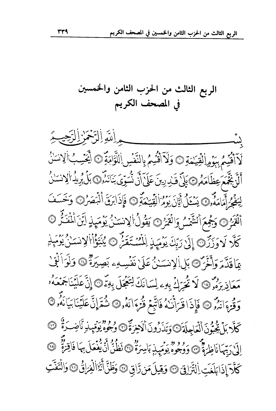 لَا أُقْسِمُ بِيَوْمِ الْقِيَامَةِ (1) وَلَا أُقْسِمُ بِالنَّفْسِ اللَّوَّامَةِ (2) أَيَحْسَبُ الْإِنْسَانُ أَلَّنْ نَجْمَعَ عِظَامَهُ (3) بَلَى قَادِرِينَ عَلَى أَنْ نُسَوِّيَ بَنَانَهُ (4) بَلْ يُرِيدُ الْإِنْسَانُ لِيَفْجُرَ أَمَامَهُ (5) يَسْأَلُ أَيَّانَ يَوْمُ الْقِيَامَةِ (6) فَإِذَا بَرِقَ الْبَصَرُ (7) وَخَسَفَ الْقَمَرُ (8) وَجُمِعَ الشَّمْسُ وَالْقَمَرُ (9) يَقُولُ الْإِنْسَانُ يَوْمَئِذٍ أَيْنَ الْمَفَرُّ (10) كَلَّا لَا وَزَرَ (11) إِلَى رَبِّكَ يَوْمَئِذٍ الْمُسْتَقَرُّ (12) يُنَبَّأُ الْإِنْسَانُ يَوْمَئِذٍ بِمَا قَدَّمَ وَأَخَّرَ (13) بَلِ الْإِنْسَانُ عَلَى نَفْسِهِ بَصِيرَةٌ (14) وَلَوْ أَلْقَى مَعَاذِيرَهُ (15) لَا تُحَرِّكْ بِهِ لِسَانَكَ لِتَعْجَلَ بِهِ (16) إِنَّ عَلَيْنَا جَمْعَهُ وَقُرْآنَهُ (17) فَإِذَا قَرَأْنَاهُ فَاتَّبِعْ قُرْآنَهُ (18) ثُمَّ إِنَّ عَلَيْنَا بَيَانَهُ (19) كَلَّا بَلْ تُحِبُّونَ الْعَاجِلَةَ (20) وَتَذَرُونَ الْآخِرَةَ (21) وُجُوهٌ يَوْمَئِذٍ نَاضِرَةٌ (22) إِلَى رَبِّهَا نَاظِرَةٌ (23) وَوُجُوهٌ يَوْمَئِذٍ بَاسِرَةٌ (24) تَظُنُّ أَنْ يُفْعَلَ بِهَا فَاقِرَةٌ (25) كَلَّا إِذَا بَلَغَتِ التَّرَاقِيَ (26) وَقِيلَ مَنْ رَاقٍ (27) وَظَنَّ أَنَّهُ الْفِرَاقُ (28) وَالْتَفَّتِ