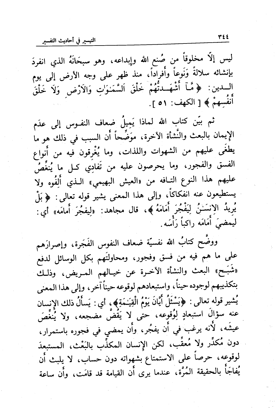 ثم بين كتاب الله لماذا يميل ضعاف النفوس إلى عدم الإيمان بالبعث والنشأة الآخرة، موضحا أن السبب في ذلك هو ما يطغى عليهم من الشهوات واللذات، وما يغرقون فيه من أنواع الفسق والفجور، وما يحرصون عليه من تفادي كل ما ينغص عليهم هذا النوع التافه من " العيش البهيمي " الذي ألفوه ولا يستطيعون عنه انفكاكا، وإلى هذا المعنى يشير قوله تعالى: {بَلْ يُرِيدُ الْإِنْسَانُ لِيَفْجُرَ أَمَامَهُ}، قال مجاهد: " ليفجر أمامه " أي: ليمضي أمامه راكبا رأسه.